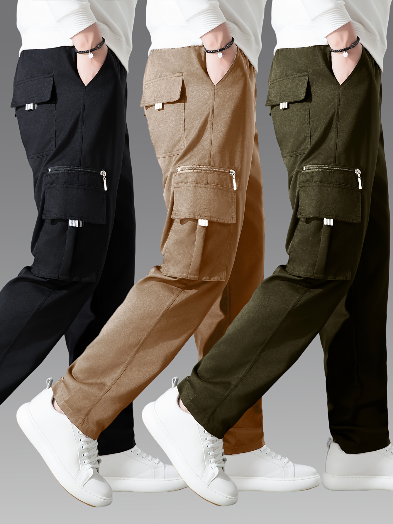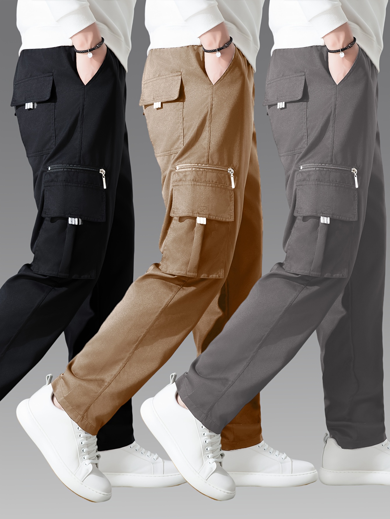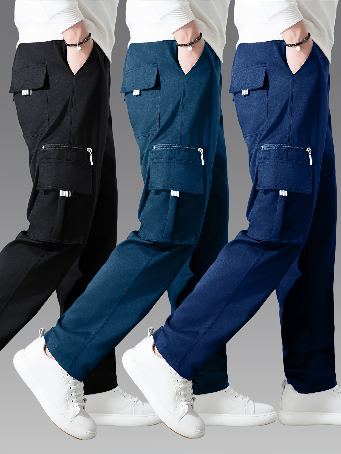 Pantalons cargo pour homme (3 pièces) – multi-poches, coupe décontractée, tissu non extensible durable, confort toutes saisons, idéal tenue décontractée et activités outdoor (noir/bleu marine/gris)