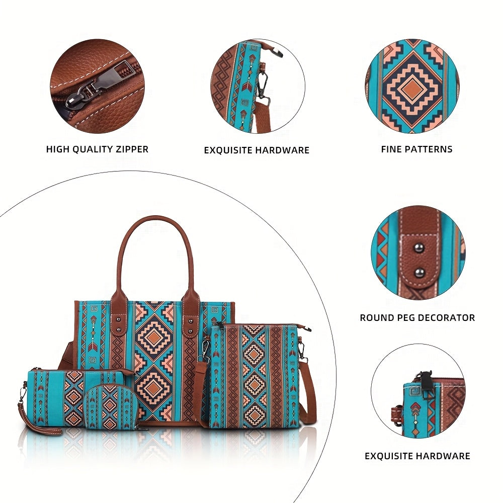 Set de 4 Sacs Cabas Boho Chic – Bandoulière Ajustable, Grande Capacité, Style Ethnique Vintage, Polyester Imprimé Aléatoire, Idéal Vacances et Cadeaux