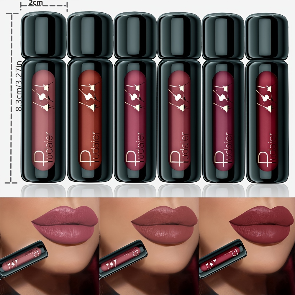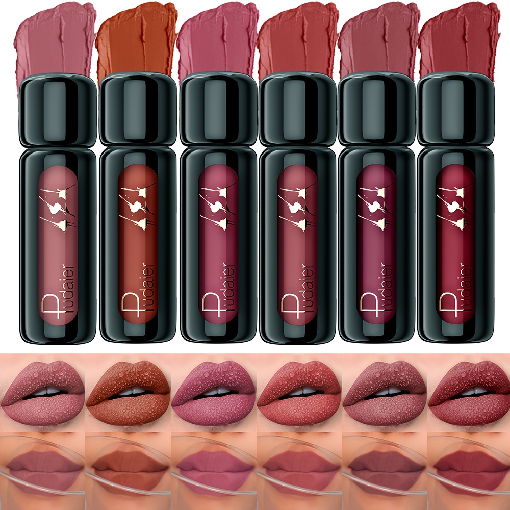 6pcs/set Pudaier Matte Velvet Lip Gloss - Highly Saturated Liquid Lip Mud, Non-Stick Long-Lasting Formula, 6-Shade Mixed Palette with Deep Berry Tones, All Light Beige Tones Compatible.