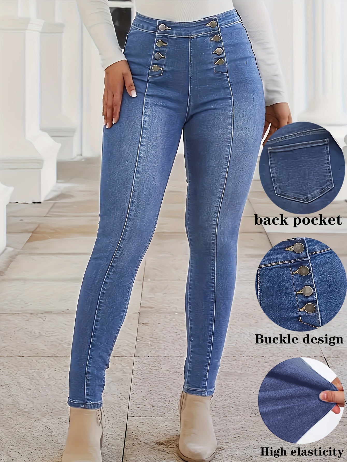 Jean skinny à boutons et plis piqués, pantalon en denim stretch moyen croisé style vintage, jean et vêtements en denim pour femme, idéal pour l'automne