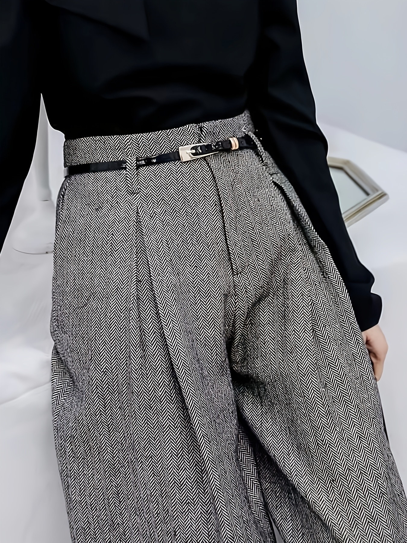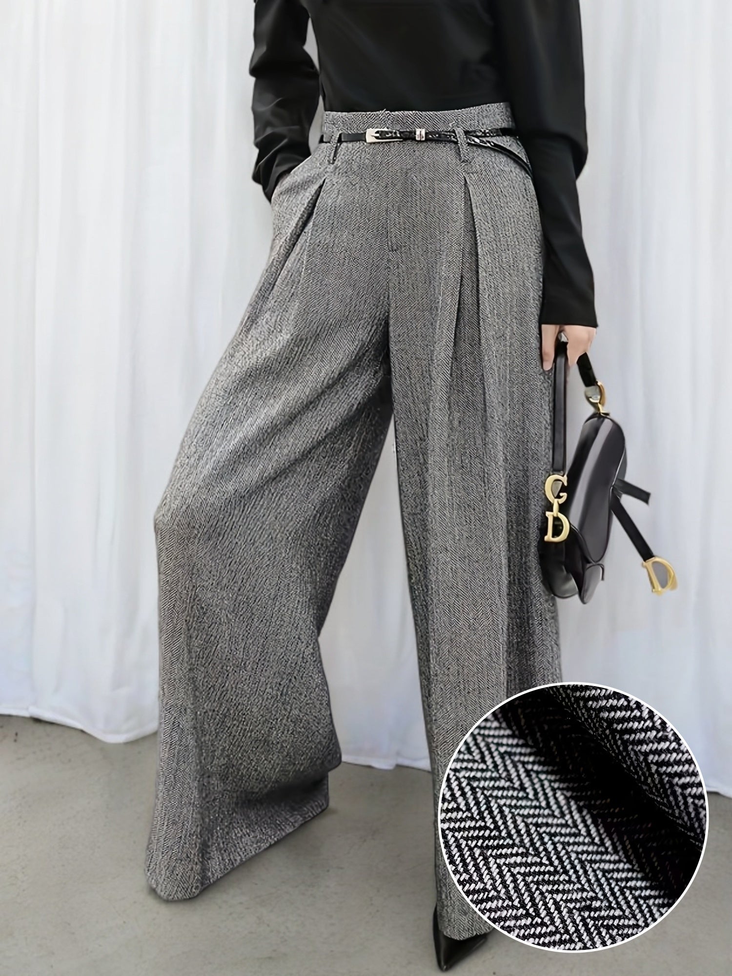 Pantalon Femme Élégant Taille Haute – Jambe Large en Tweed, Détail Plissé, Motif Géométrique Gris Clair, Sans Ceinture, Bureau et Décontracté