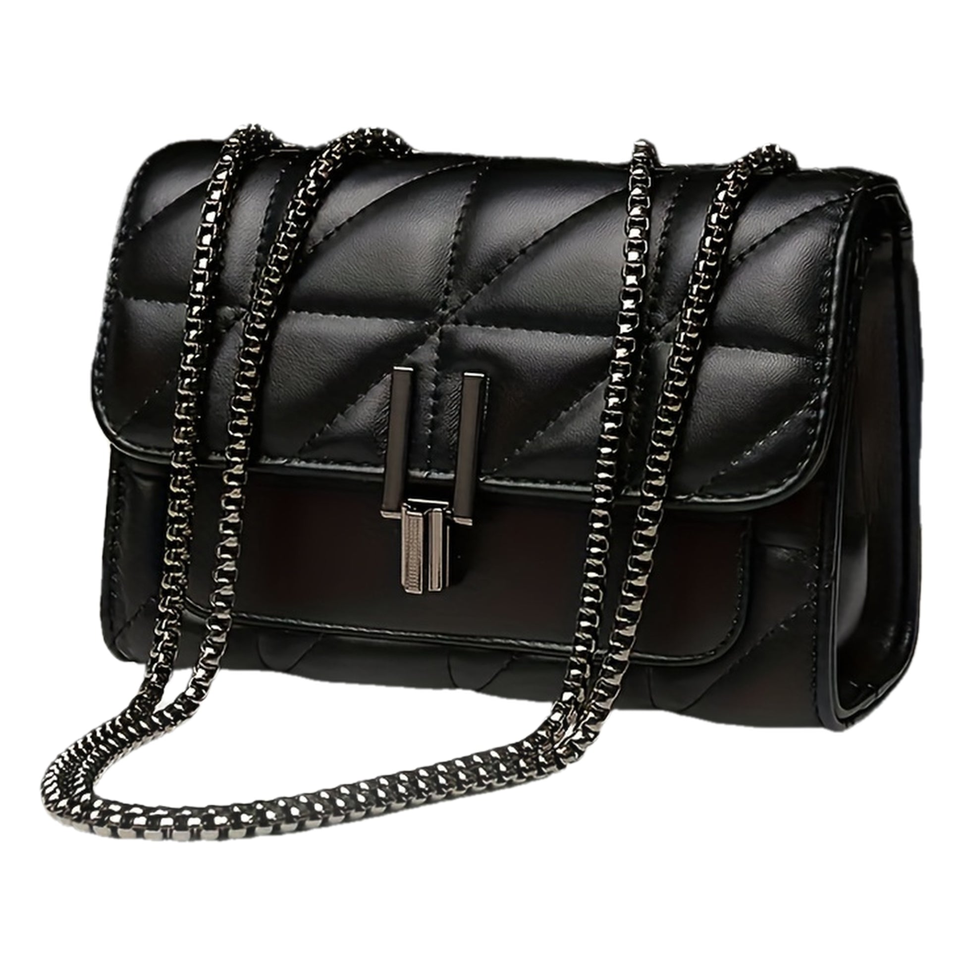 Sac à bandoulière noir élégant en similicuir avec chaîne – style chic, motif à carreaux, fermeture à tourniquet, doublure synthétique, idéal pour les occasions décontractées et formelles.