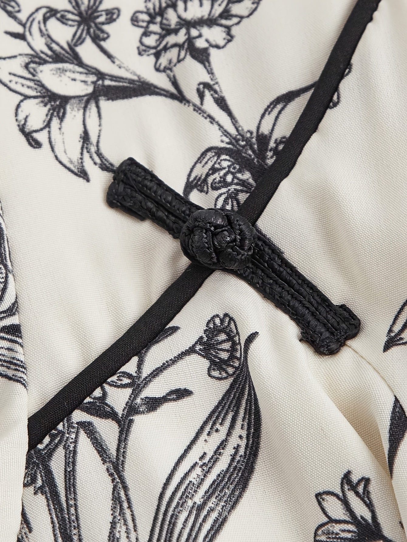 Robe courte chinoise femme – Col montant, manches bouffantes, taille cintrée, motif floral