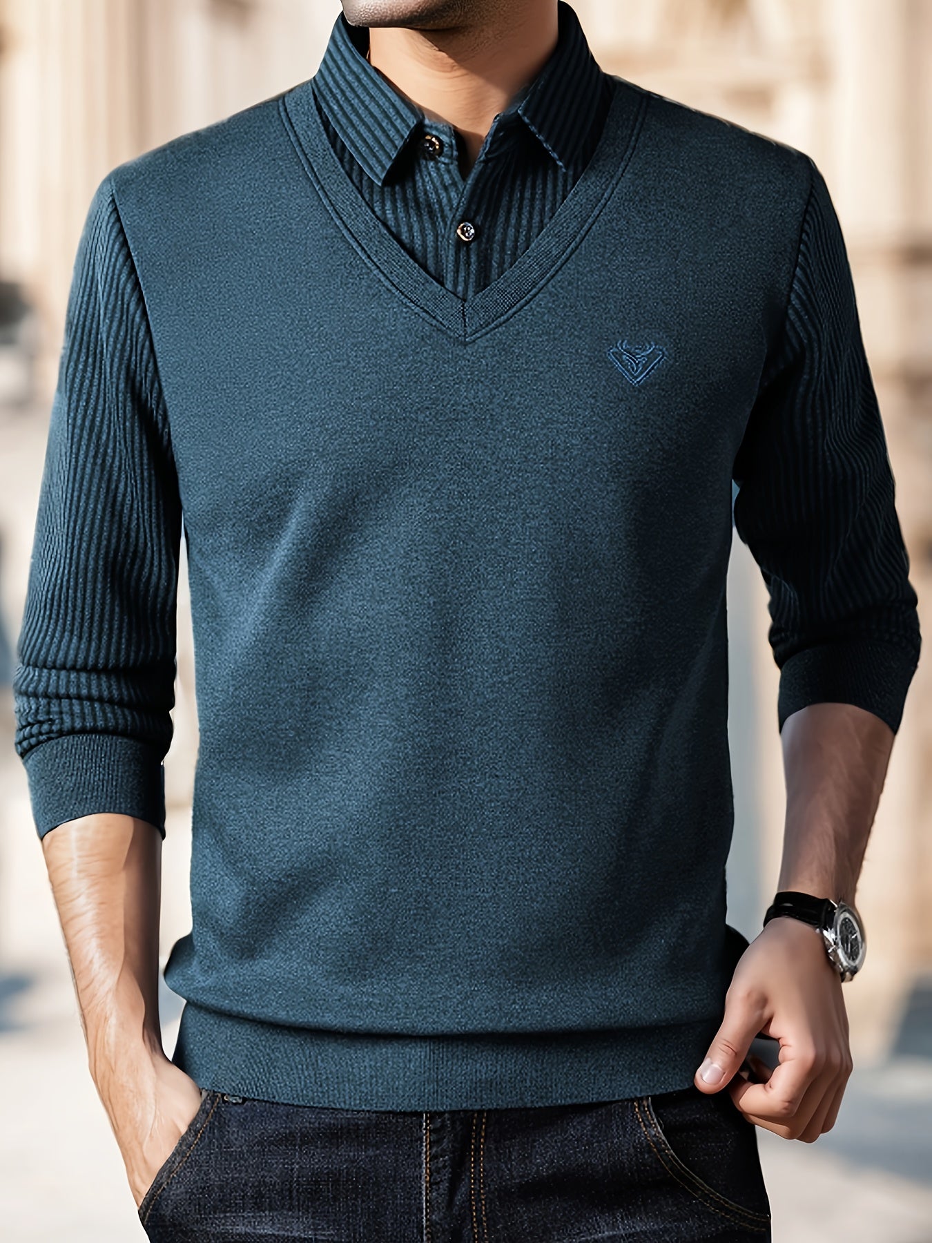 Men's Casual Knit Polyester Sweater - Long Sleeve Layered-Look Lapel Collar with Striped Pattern and Embroidered Detail - Perfect for Sports, Travel, and Office Wear - Spring/Fall Lightweight Stretch Pullover