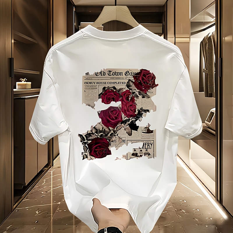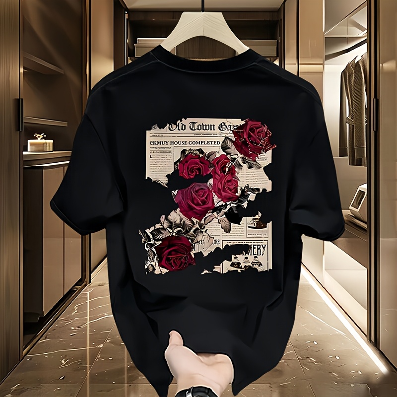 Men'S Heavyweight T-Shirt - Black Graphic Tee with Red Roses & Newspaper Print, Loose Fit Casual Shirt for Everyday & Formal Outfits - Breathable Summer Top for Teens & Adults - Everyday Essential Wardrobe Staple, Relaxed Out
