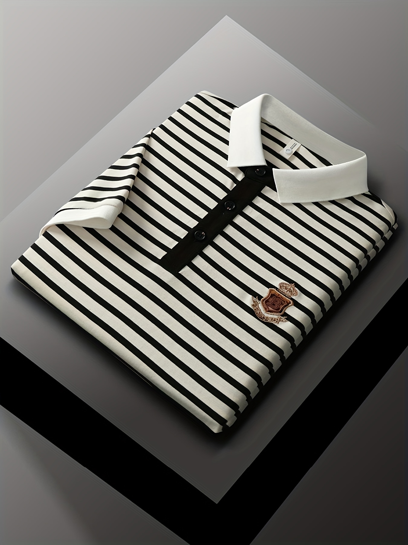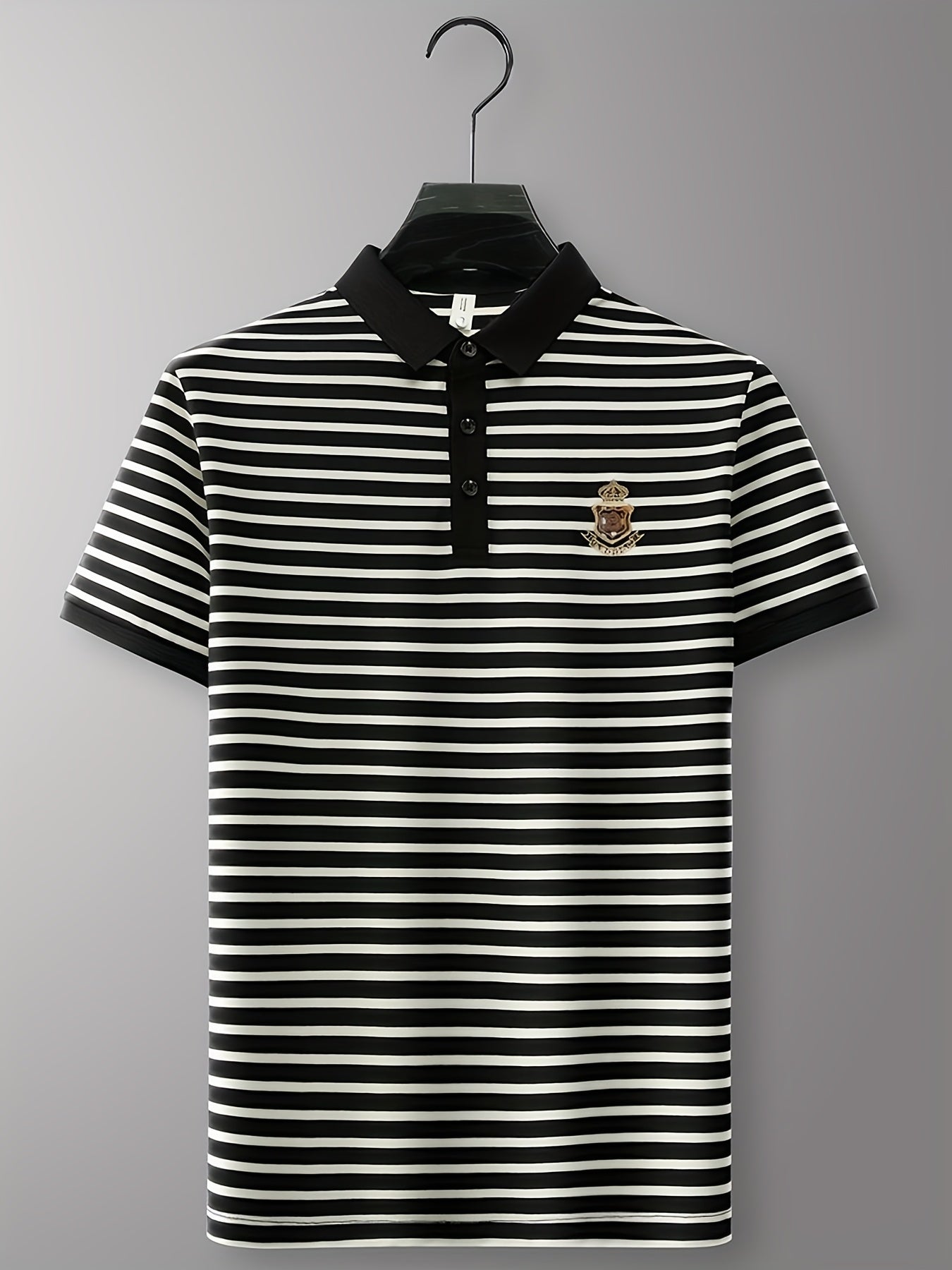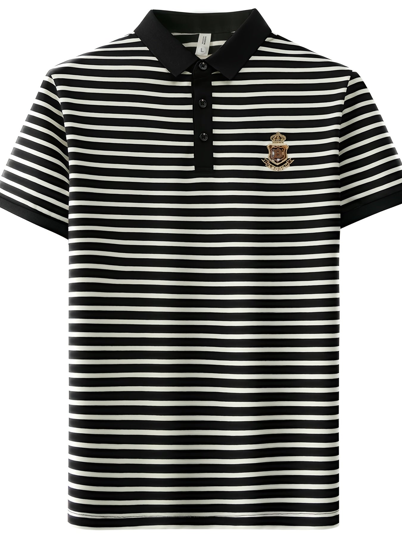 Men's Slim Fit Golf Shirt - Black & White Striped Breathable Short Sleeve with Logo, Button-Up Collar for Outdoor Sports & Casual Wear, Machine Washable
