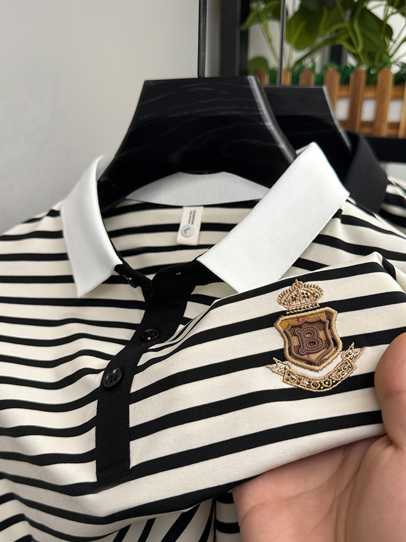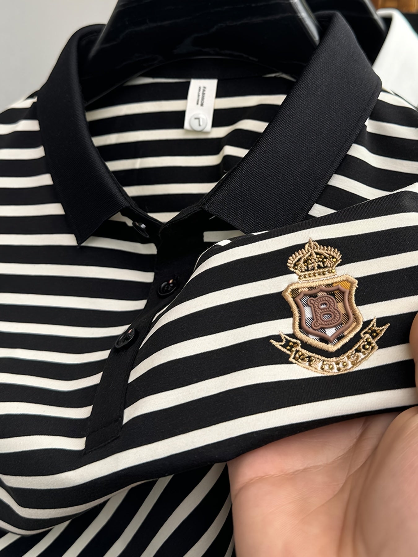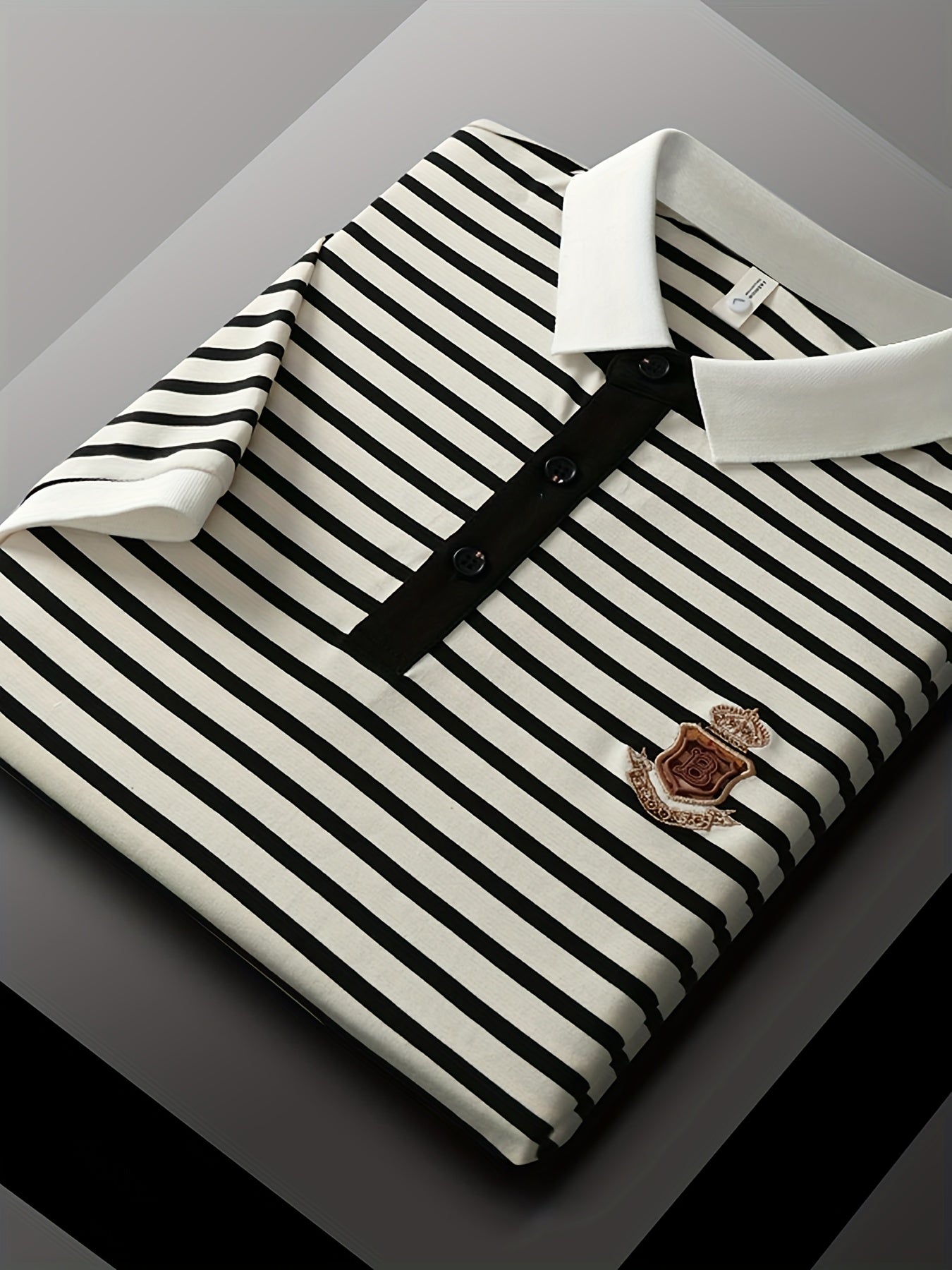 Men's Slim Fit Golf Shirt - Black & White Striped Breathable Short Sleeve with Logo, Button-Up Collar for Outdoor Sports & Casual Wear, Machine Washable