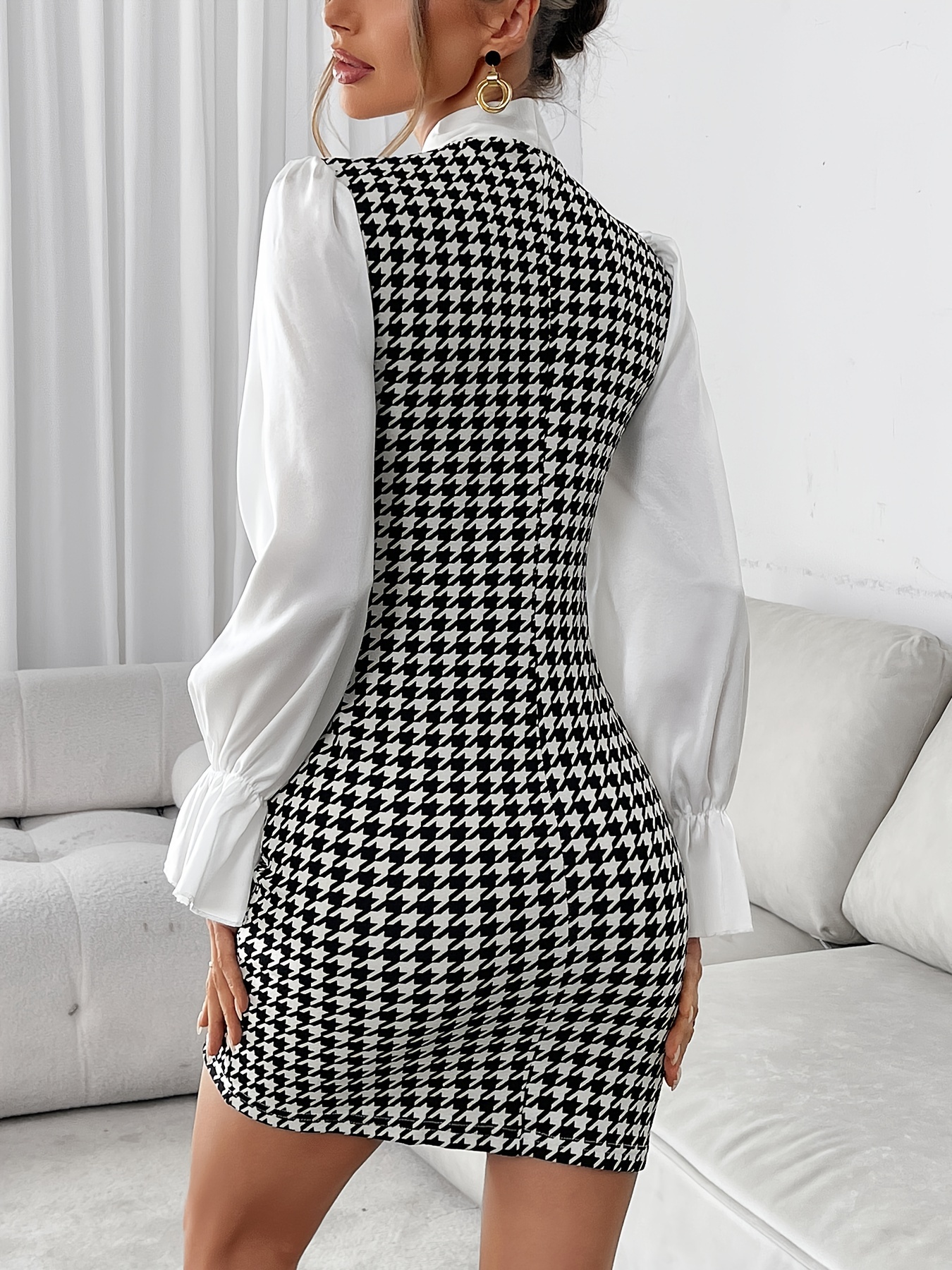 Robe Automne-Hiver Nouvelle Tendance — Imprimé Pied-de-Poule Stylé, Coupe Ajustée Bicolore, Couleur Unie Élégante, Manches Évasées, Manches Longues Courtes avec Col à Nouer