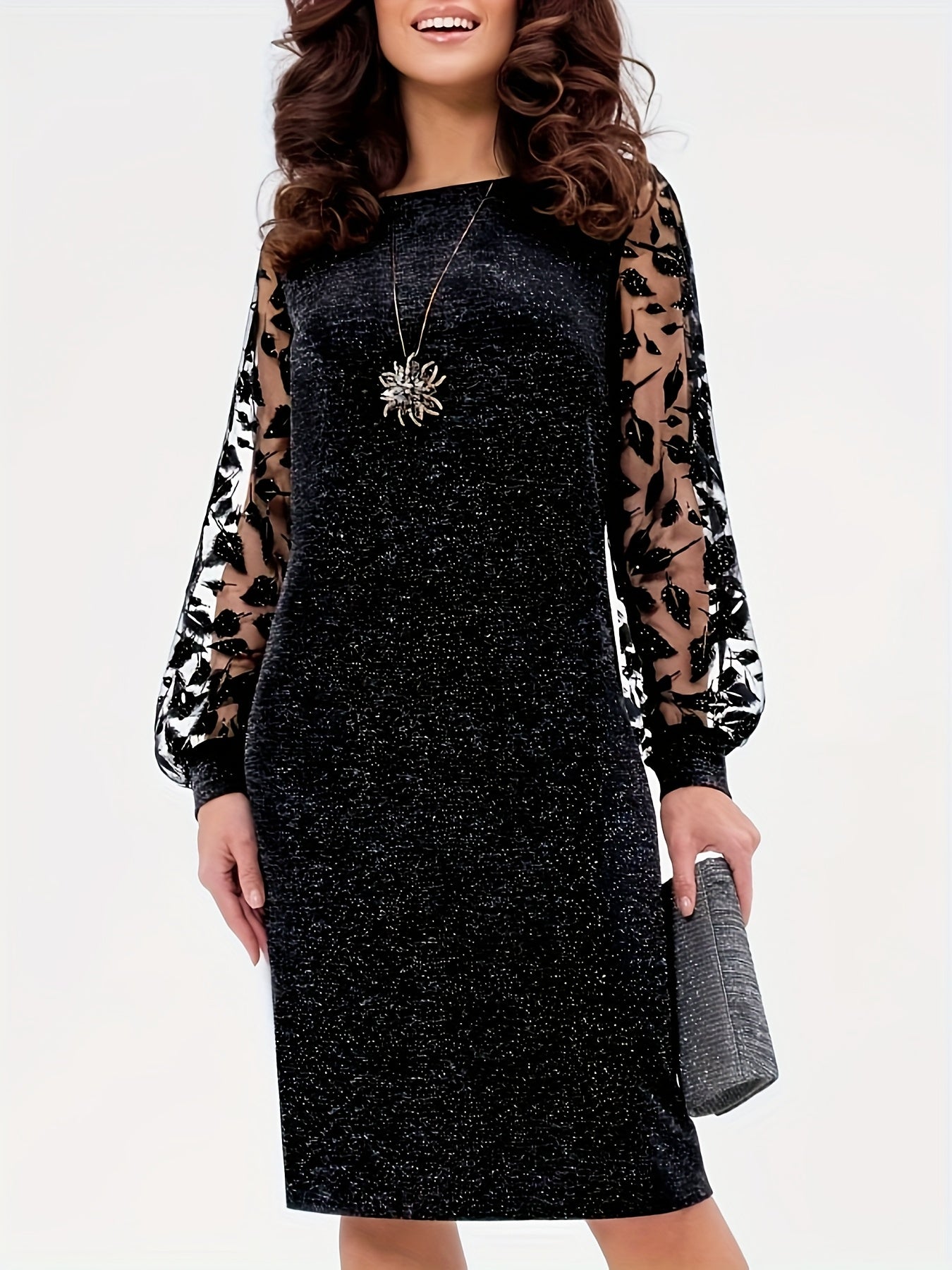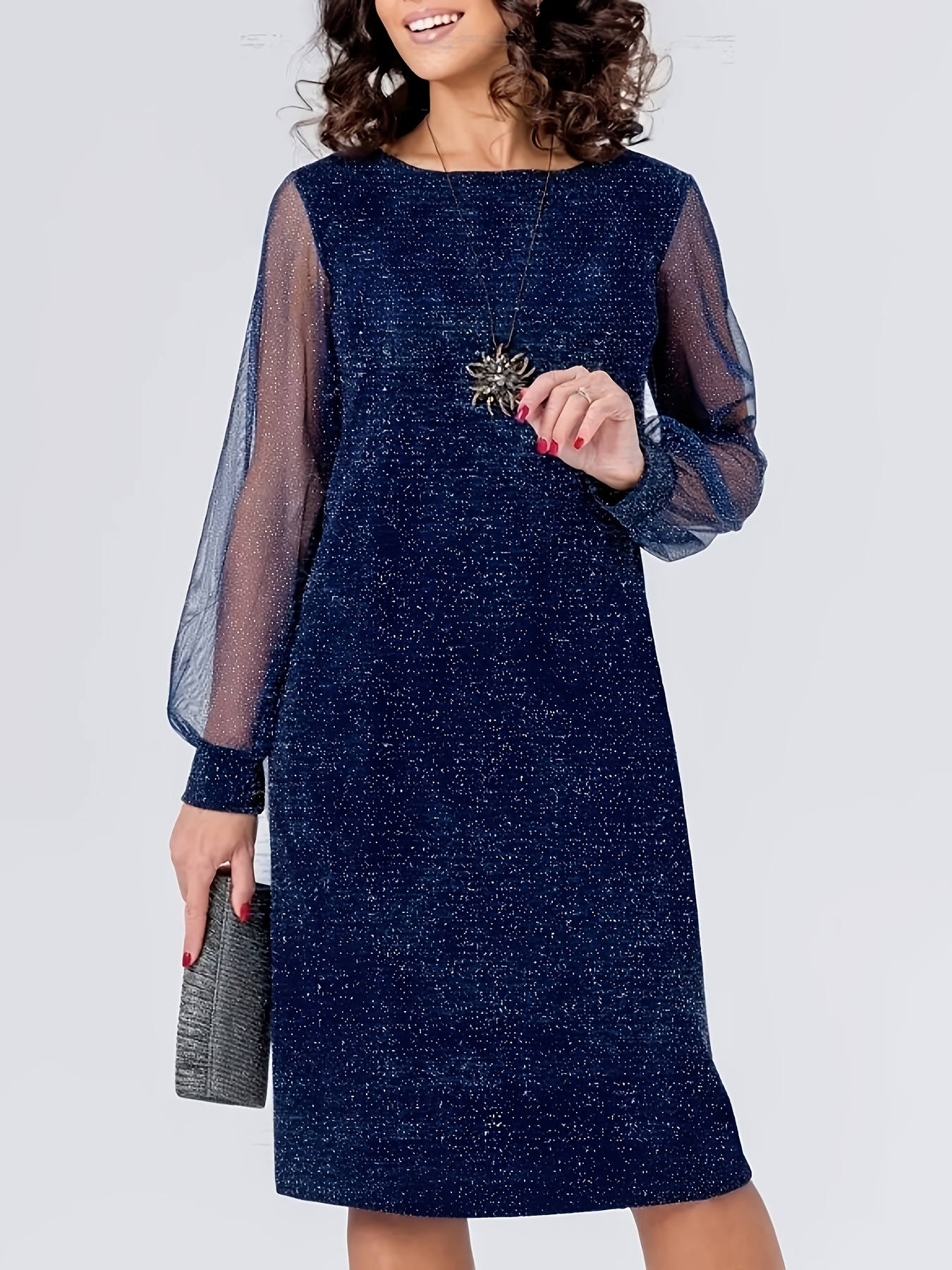 New Spring/Autumn Dress with Mesh Patchwork, Round Neck, Long Sleeves, Fashionable Fabric, Fit Dress