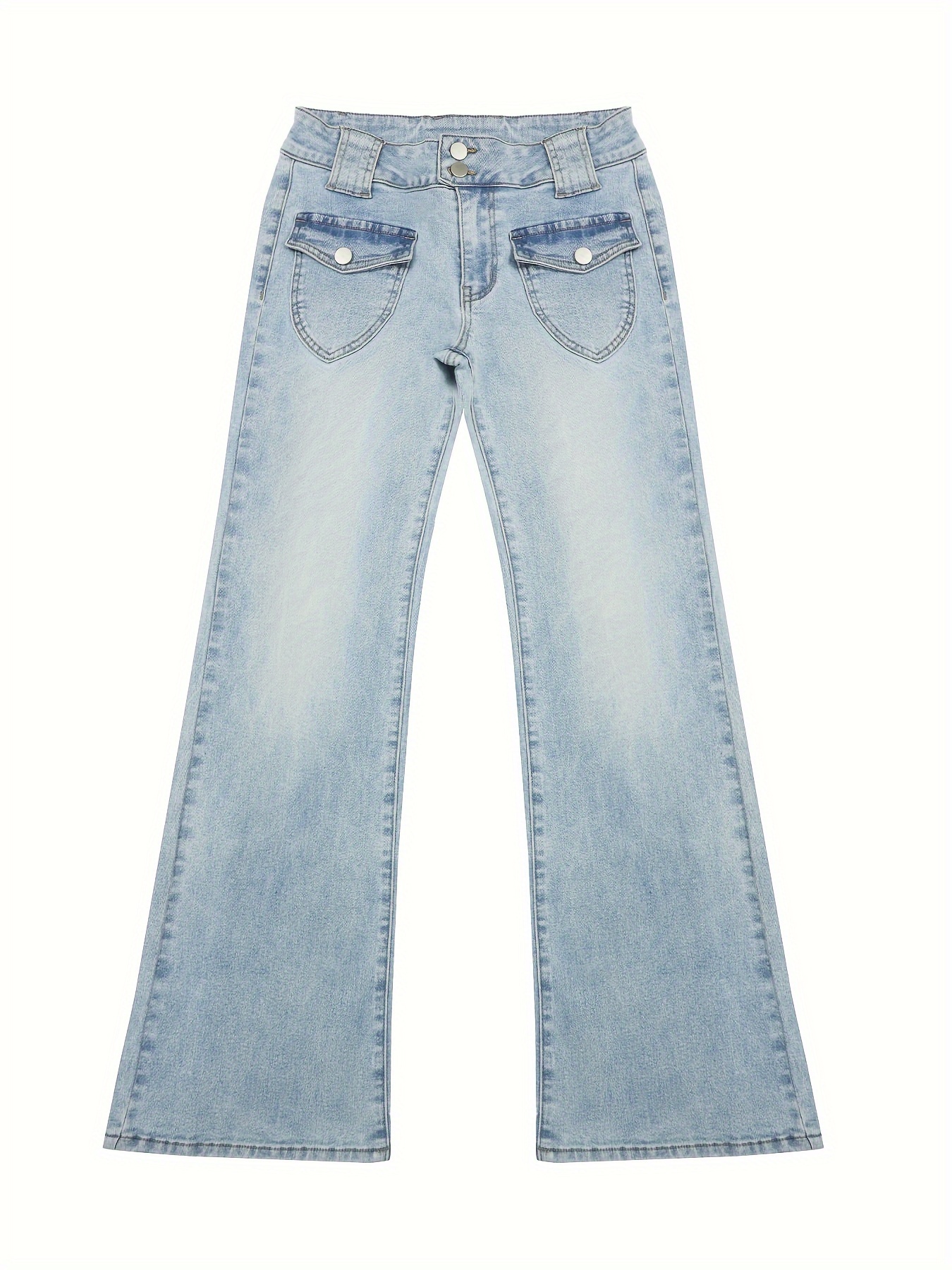 Jeans Femme Sexy Rétro Taille Basse Slim-Fit Évasé Extensible Bleu Clair Effet Usé Poches Utilitaires Double Boutons Zippé