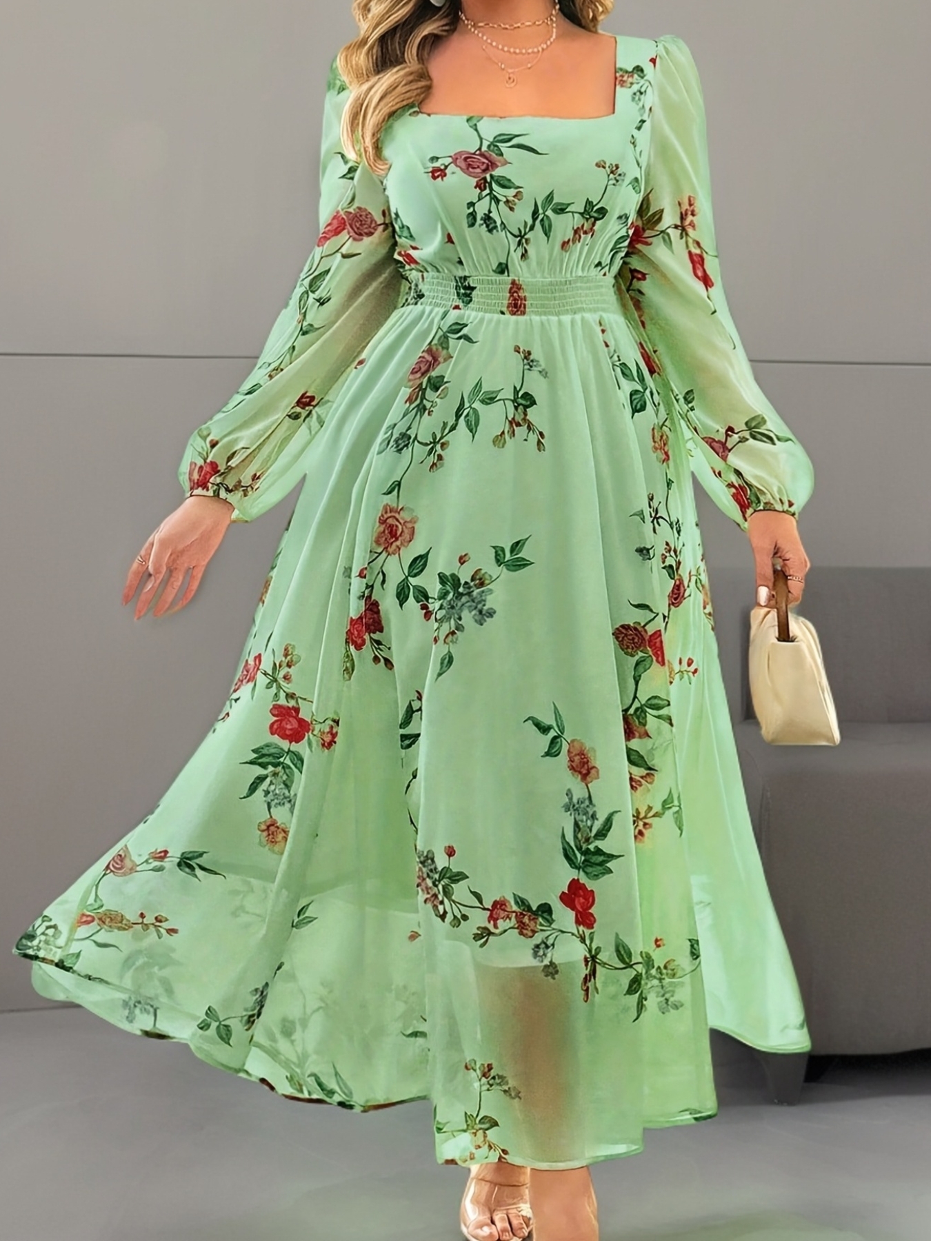 Robe Longue Grande Taille Élégante – Imprimé Floral, Col Carré, Manches Lanternes, Coupe Flare, Légère et Respirante, Idéale Vacances et Sorties Décontractées