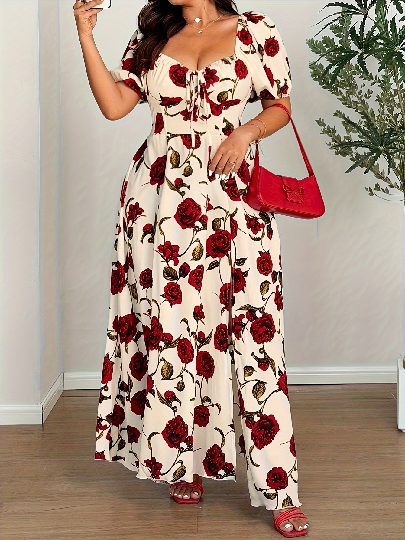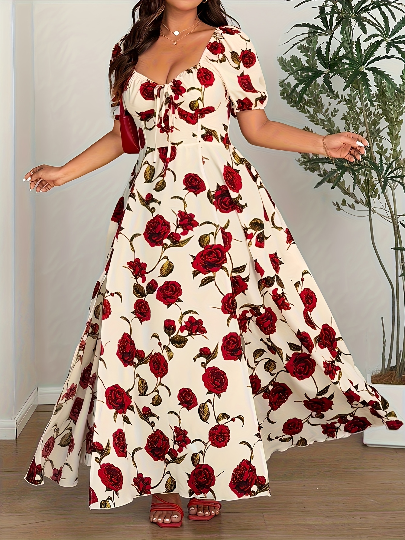 Robe d’été élégante grande taille femme – imprimé rose, épaules dénudées, fente sur le côté