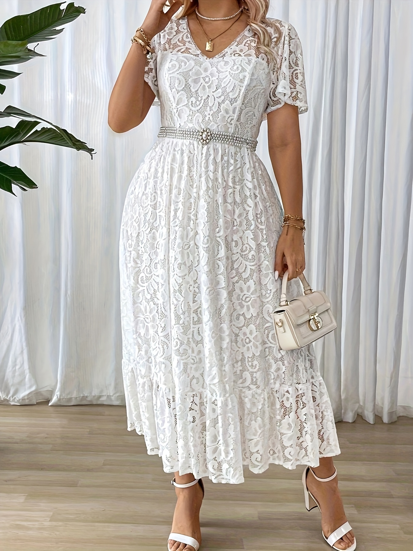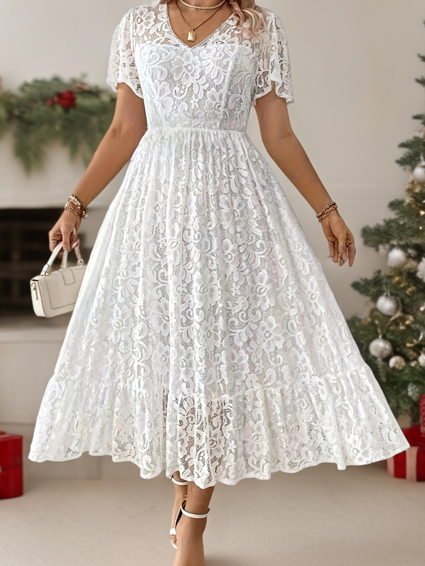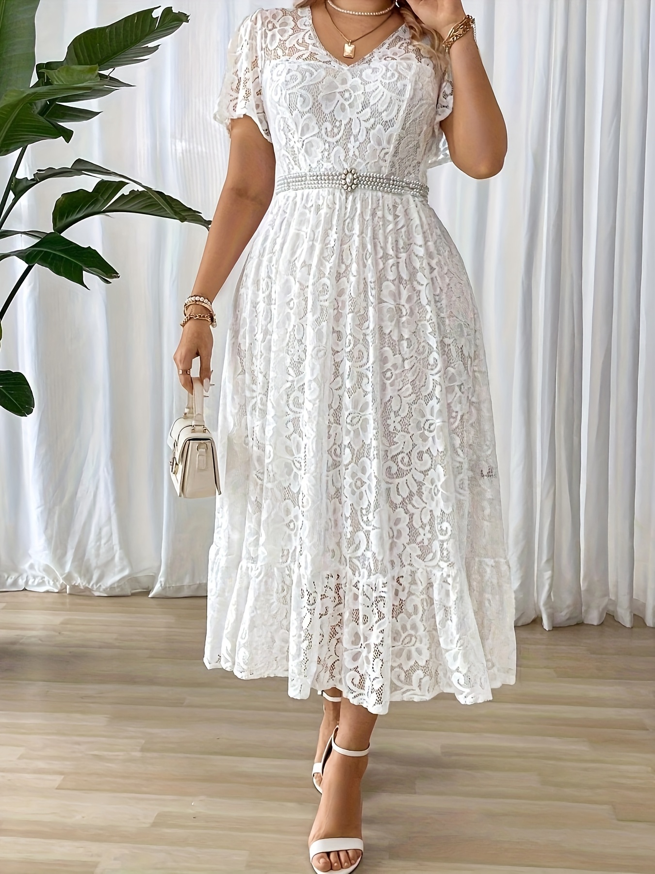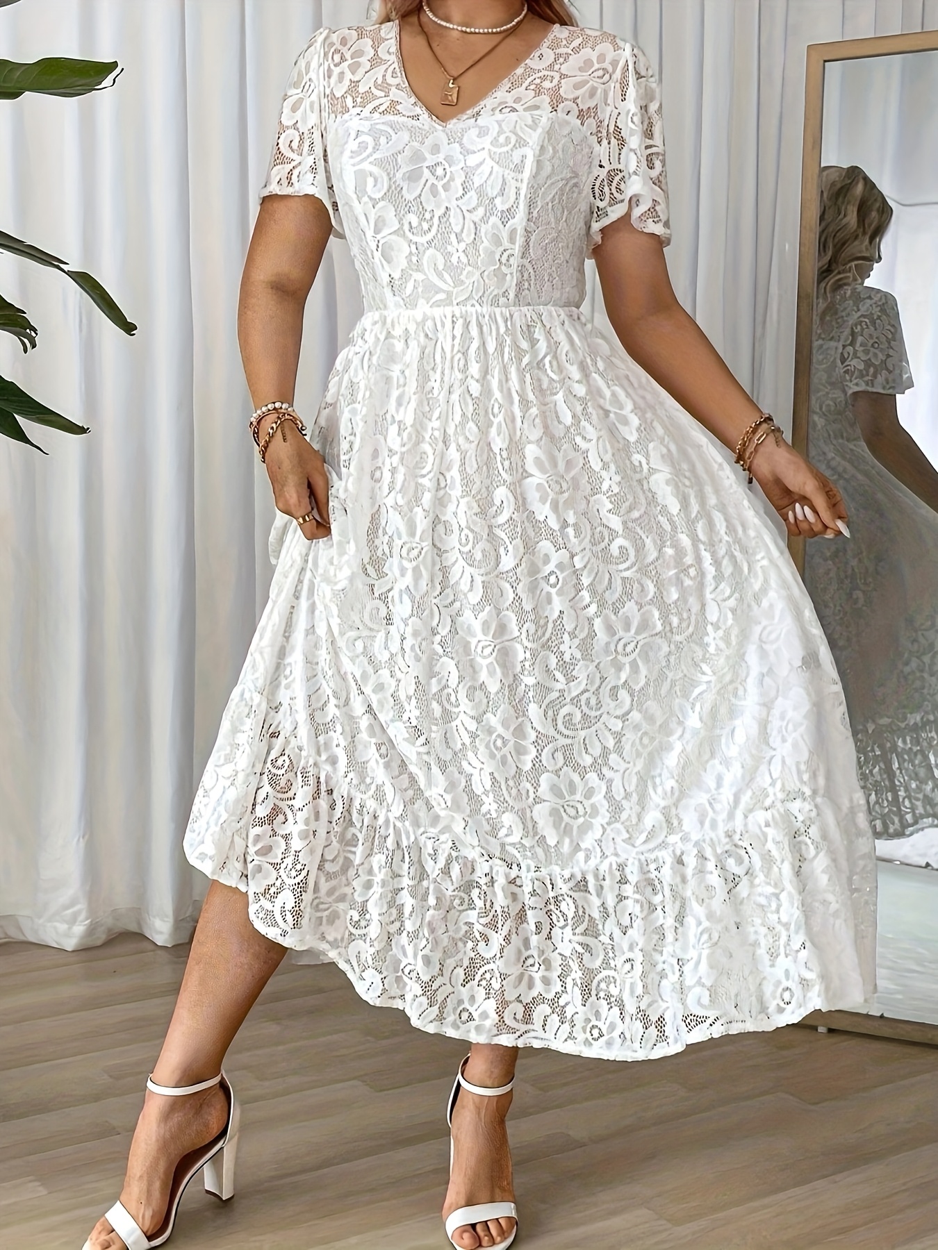 Robe Longue Grande Taille Élégante – Col Dentelle, Bas Smock, Couleur Unie Noire, Coupe A-Ligne, Idéale Soirées, Mariages et Événements Formels, Lavable en Machine