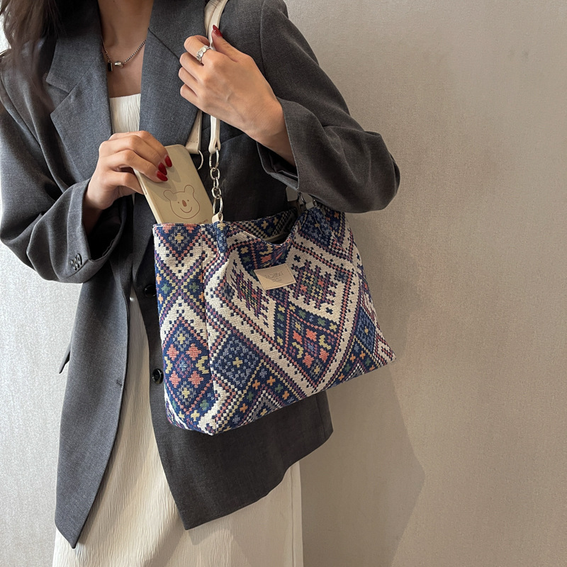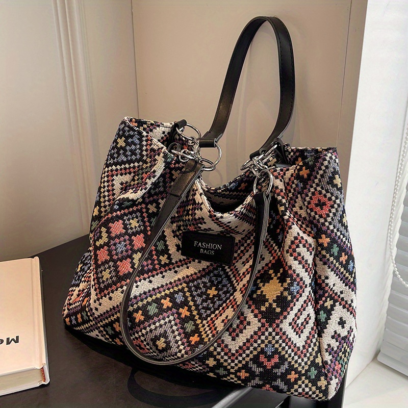 Sac Cabas Femme Ethnique Rétro – Grande Capacité, Réutilisable, Sac à Épaule avec Fermeture Éclair, Design Noir et Bleu, Sac Décontracté pour Voyages et Plage