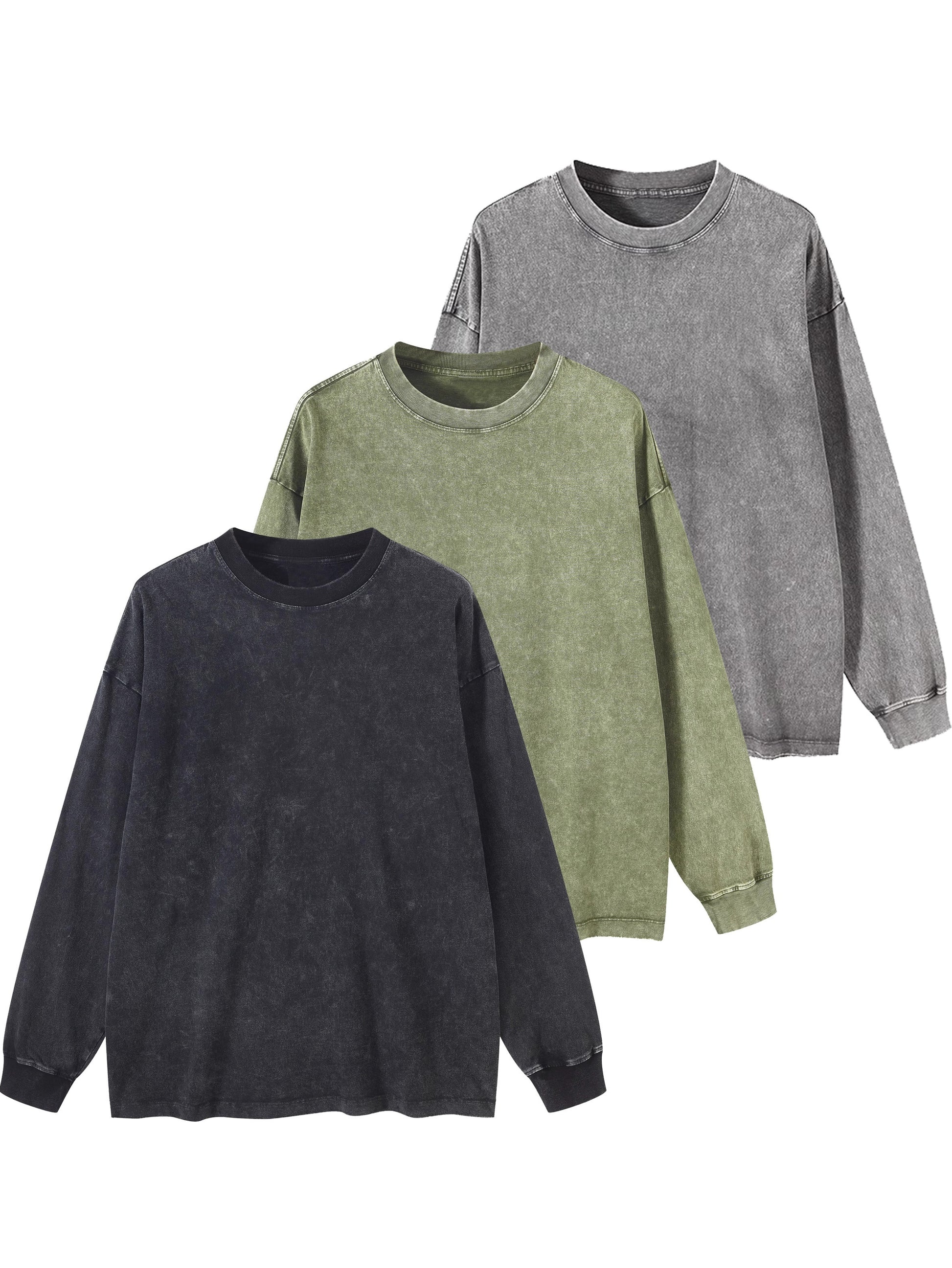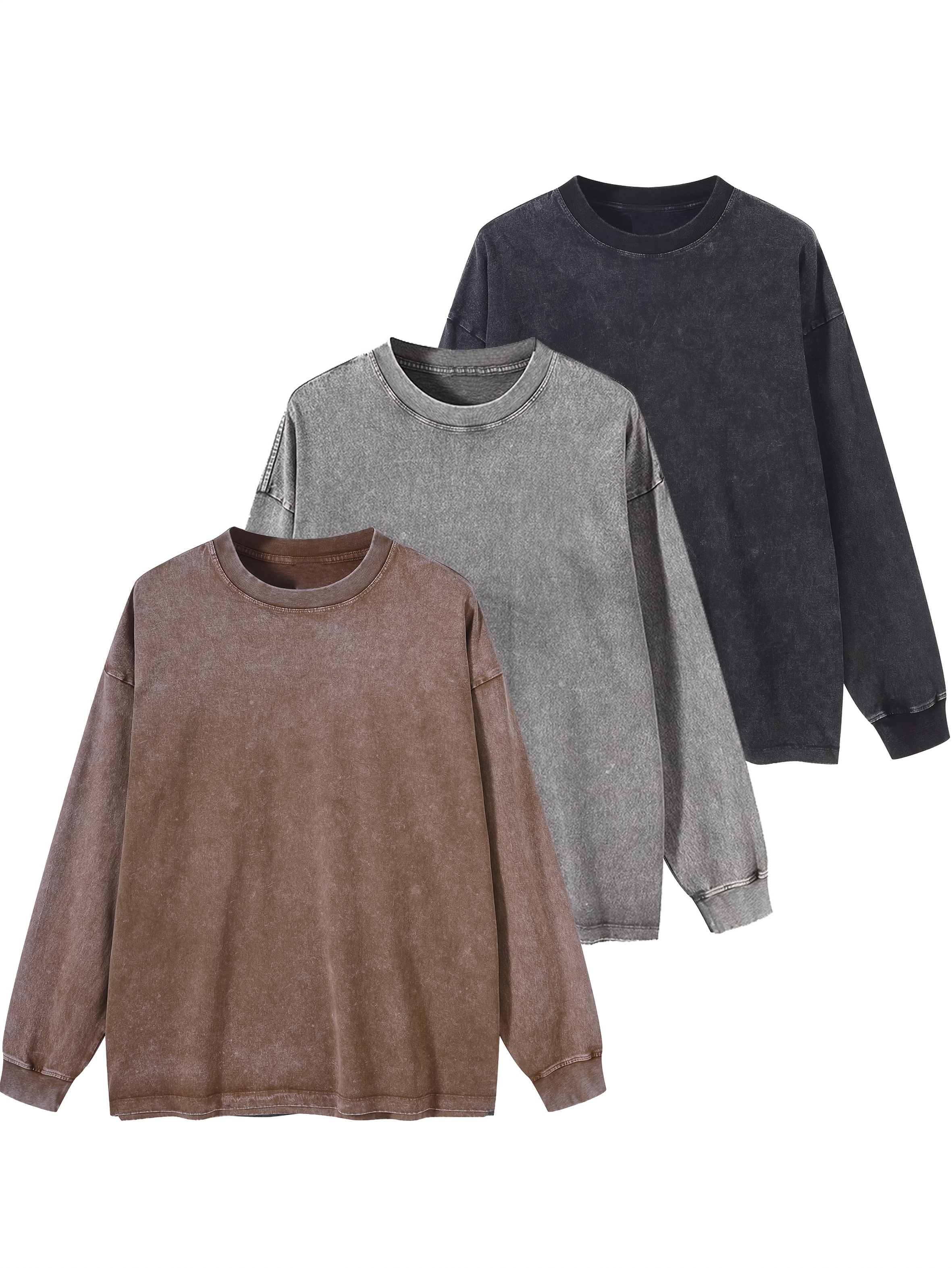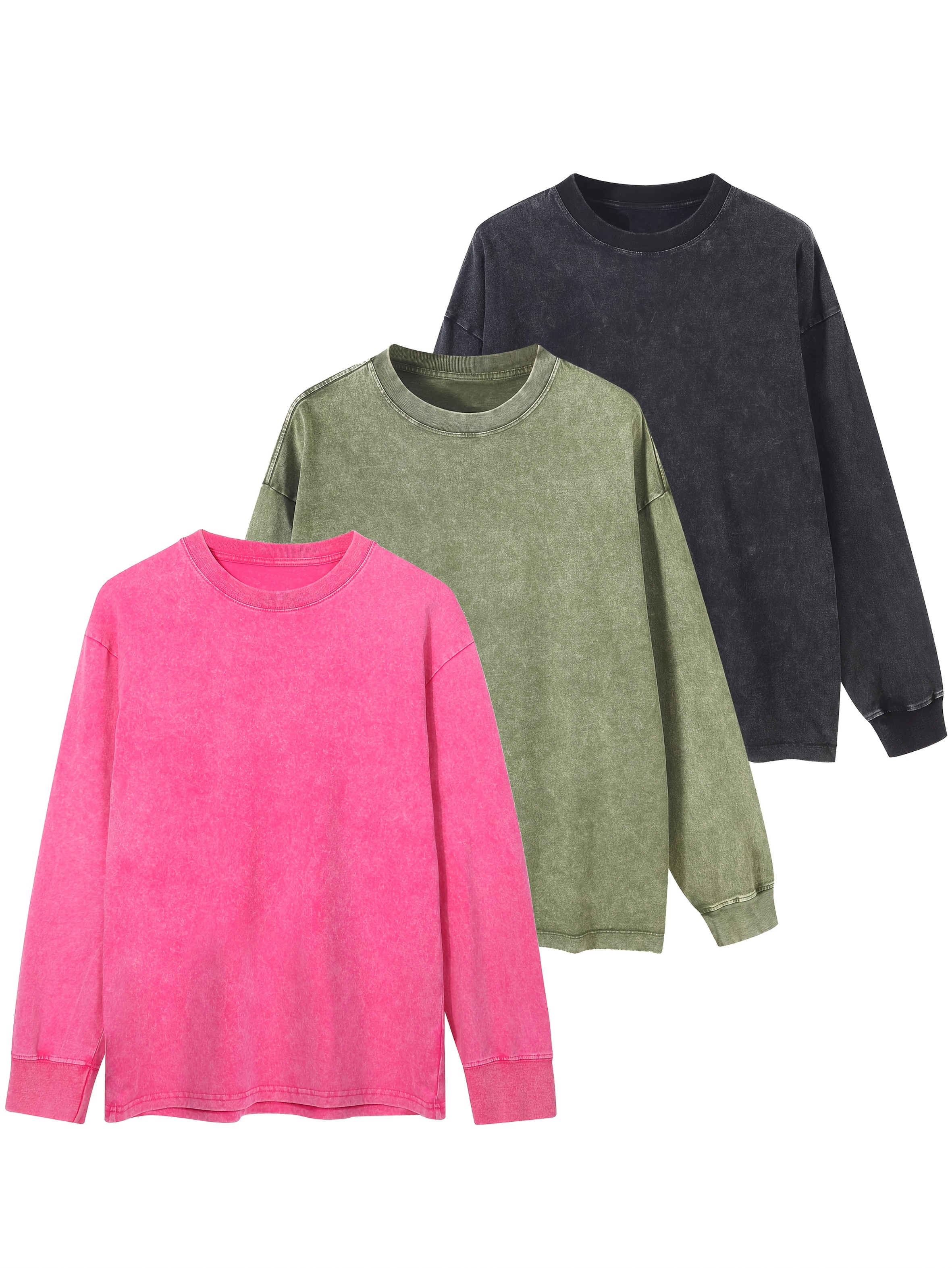 Lot de 3 t-shirts unisexes printemps/automne/hiver – manches longues, col rond côtelé, 240 g, coton pur lourd, style vintage usé délavé, tendance pour couples, nouveau