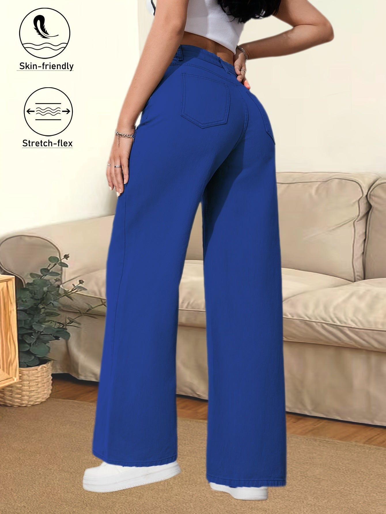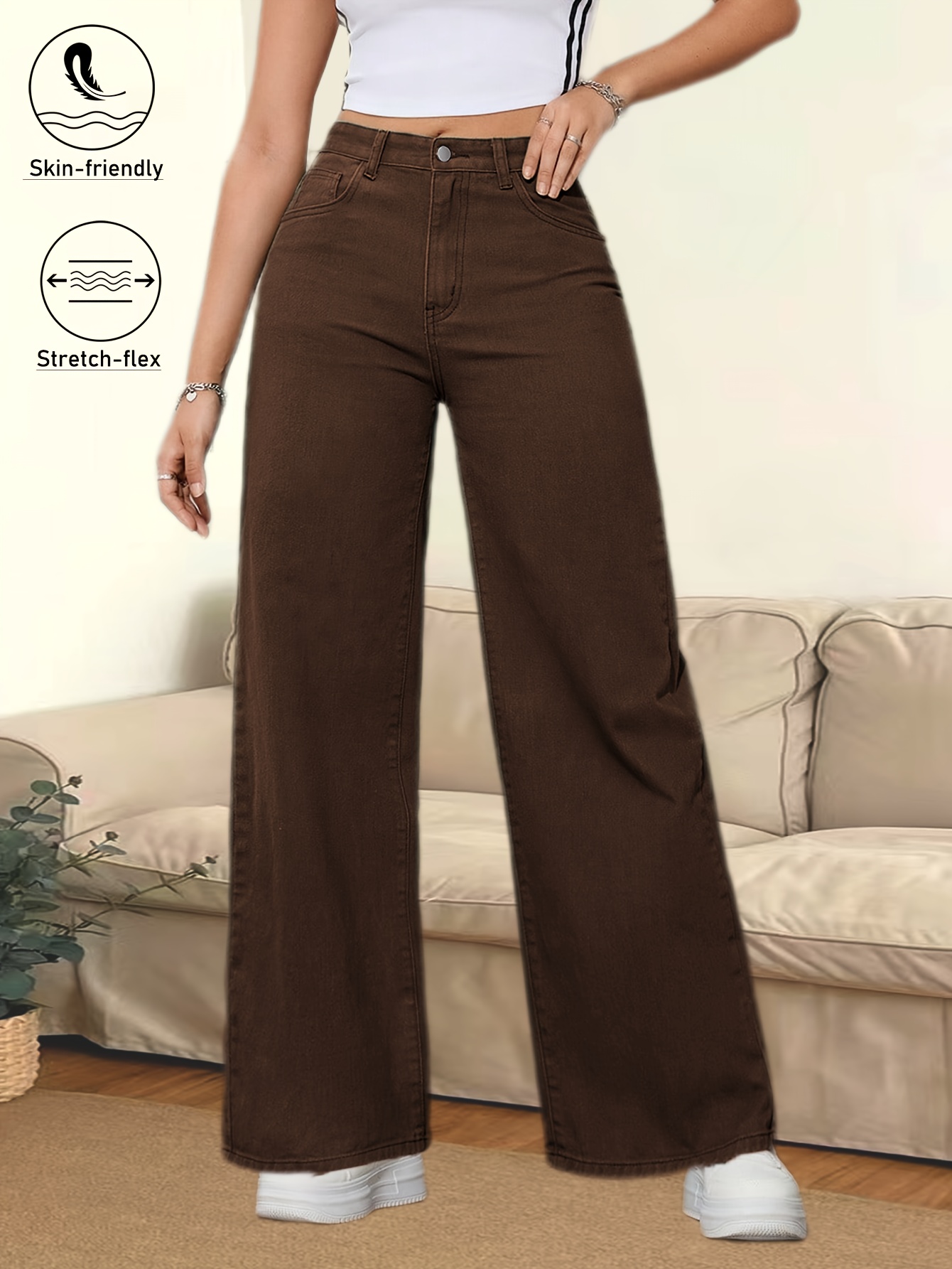 Jeans Femme Marron Café Jambe Large Poches Multiples Boutons Taille Mi-Haute Extensible Toute Saison Polyvalent Confortable Élégant