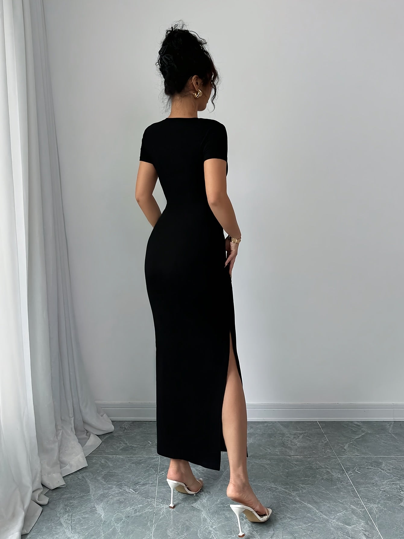 Women's Elegant -Line Dress with Slit - -Length or -the-knee Dress Suitable for Weddings, Parties, Business Events - Machine Washable Solid Color Dress with Round Neck & -Line Silhouette