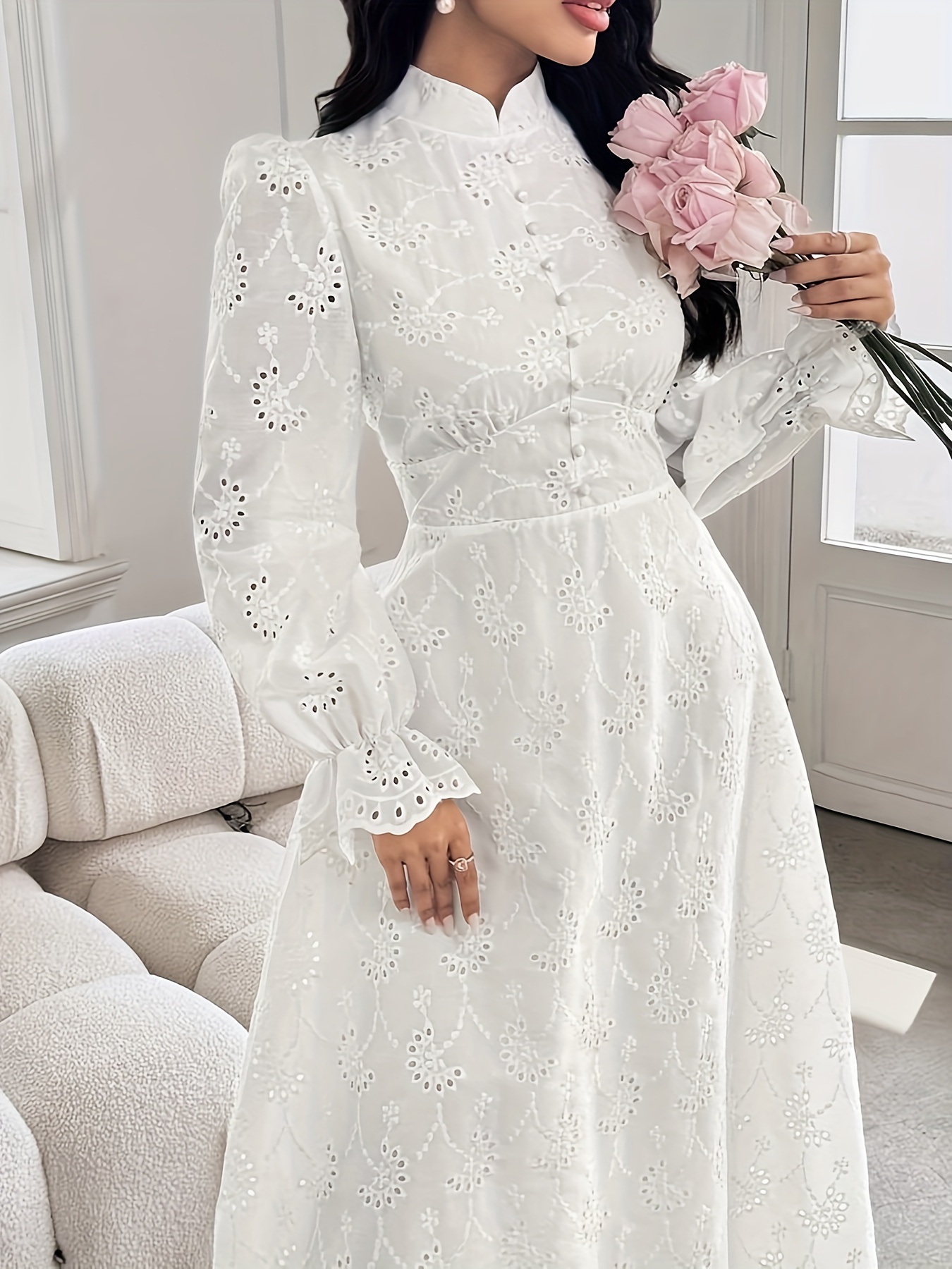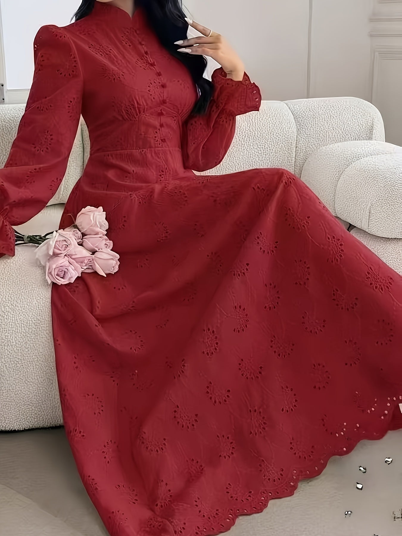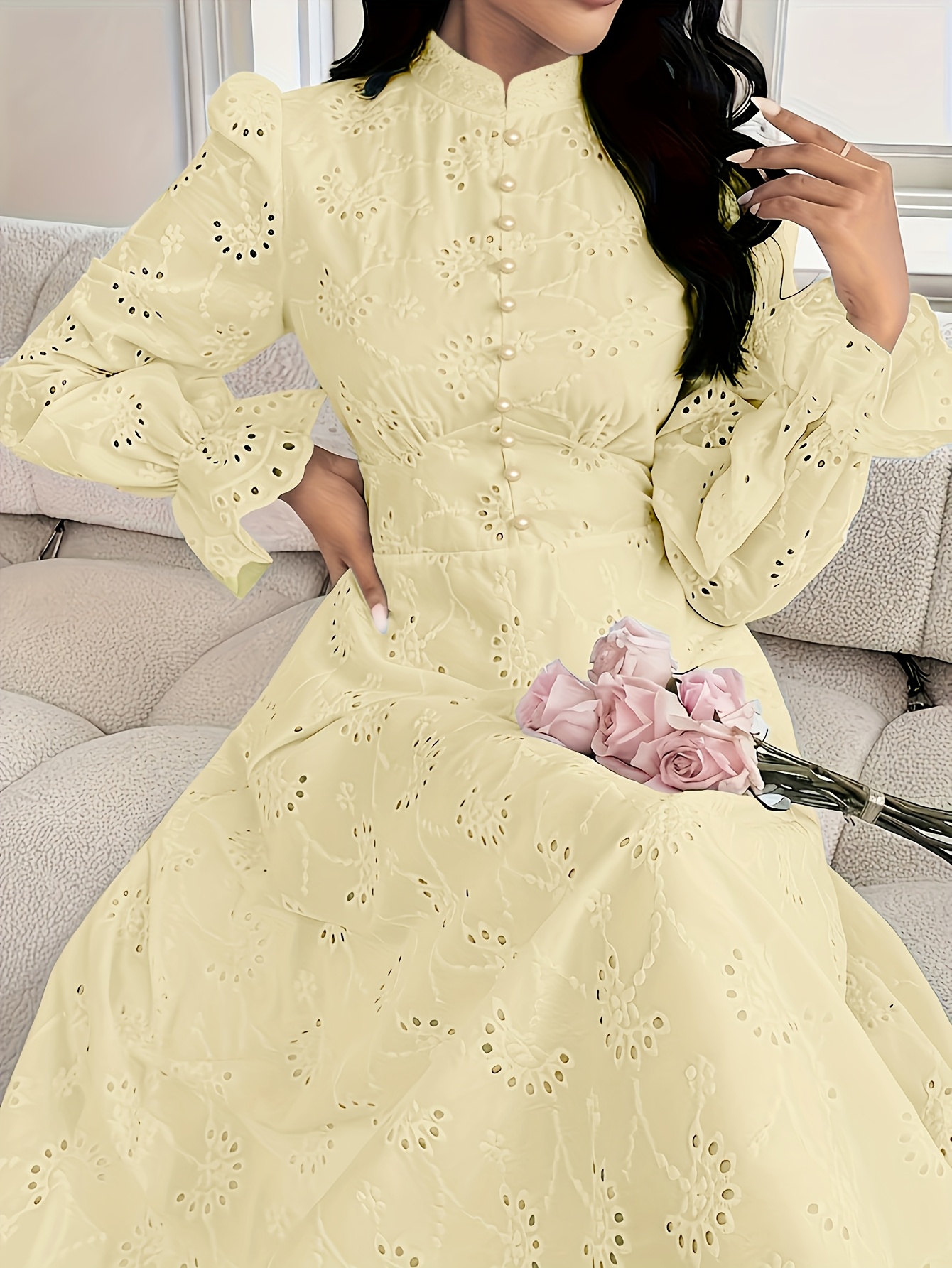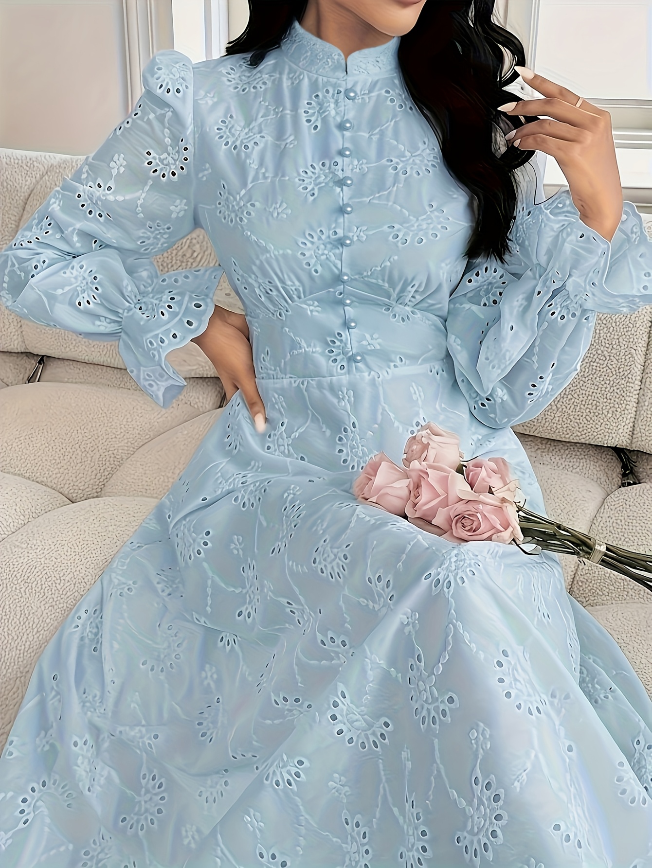 Women'S French Embroidered Stand Collar Puff Sleeve Dress Featuring a Ruffled Design, Suitable for Dates, Vacations, Parties, And Everyday Commuting.
