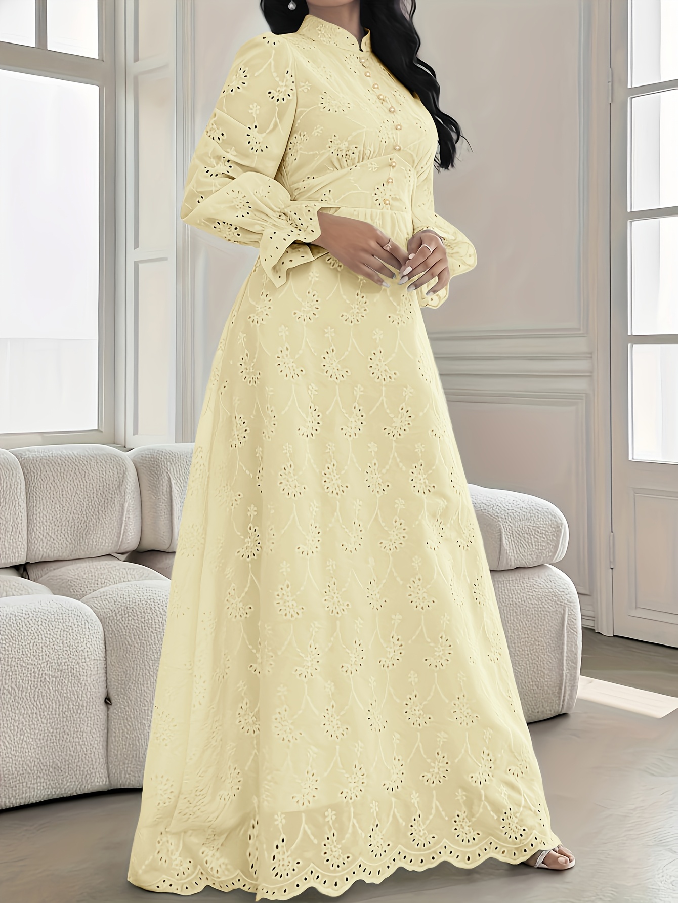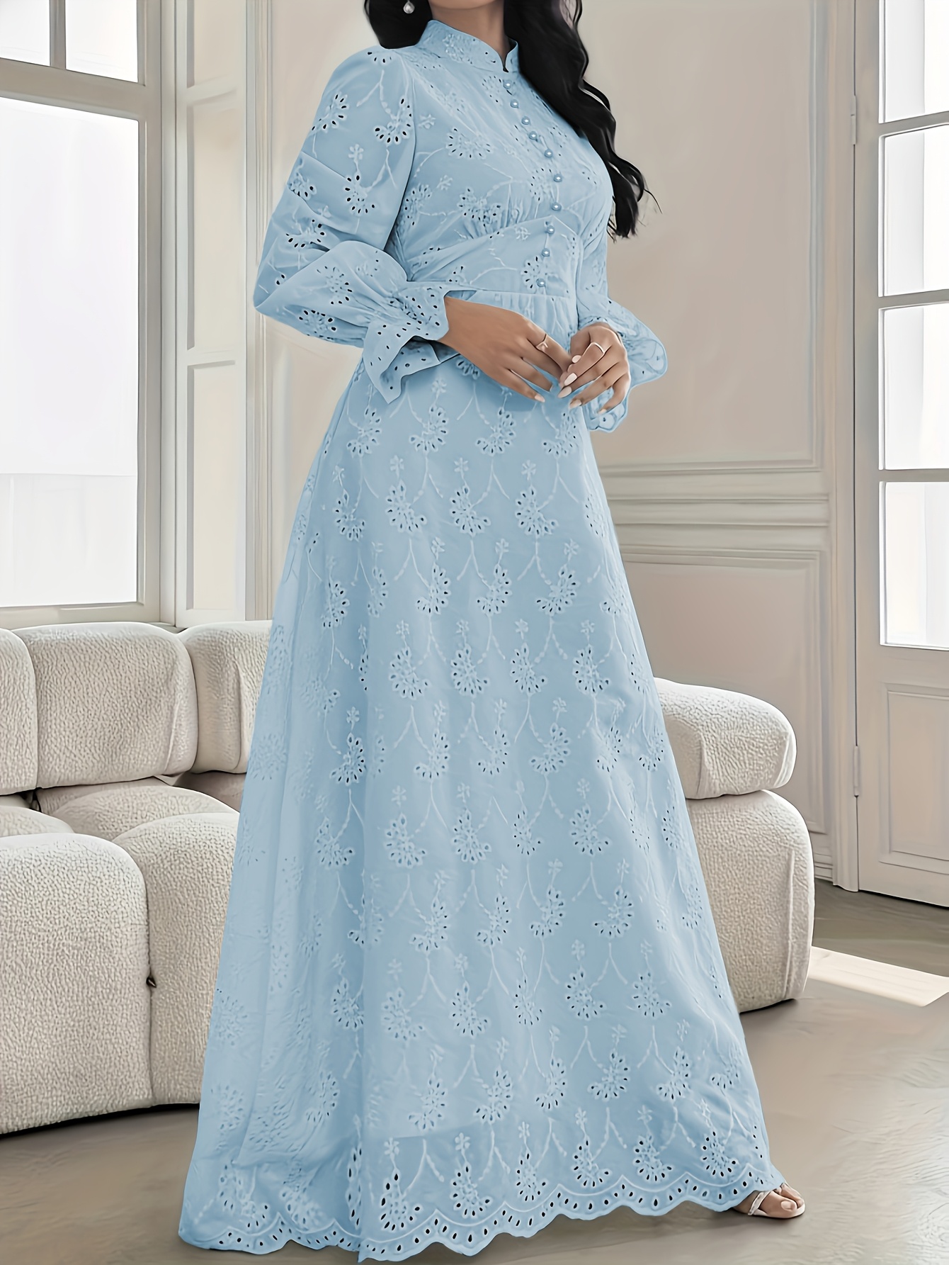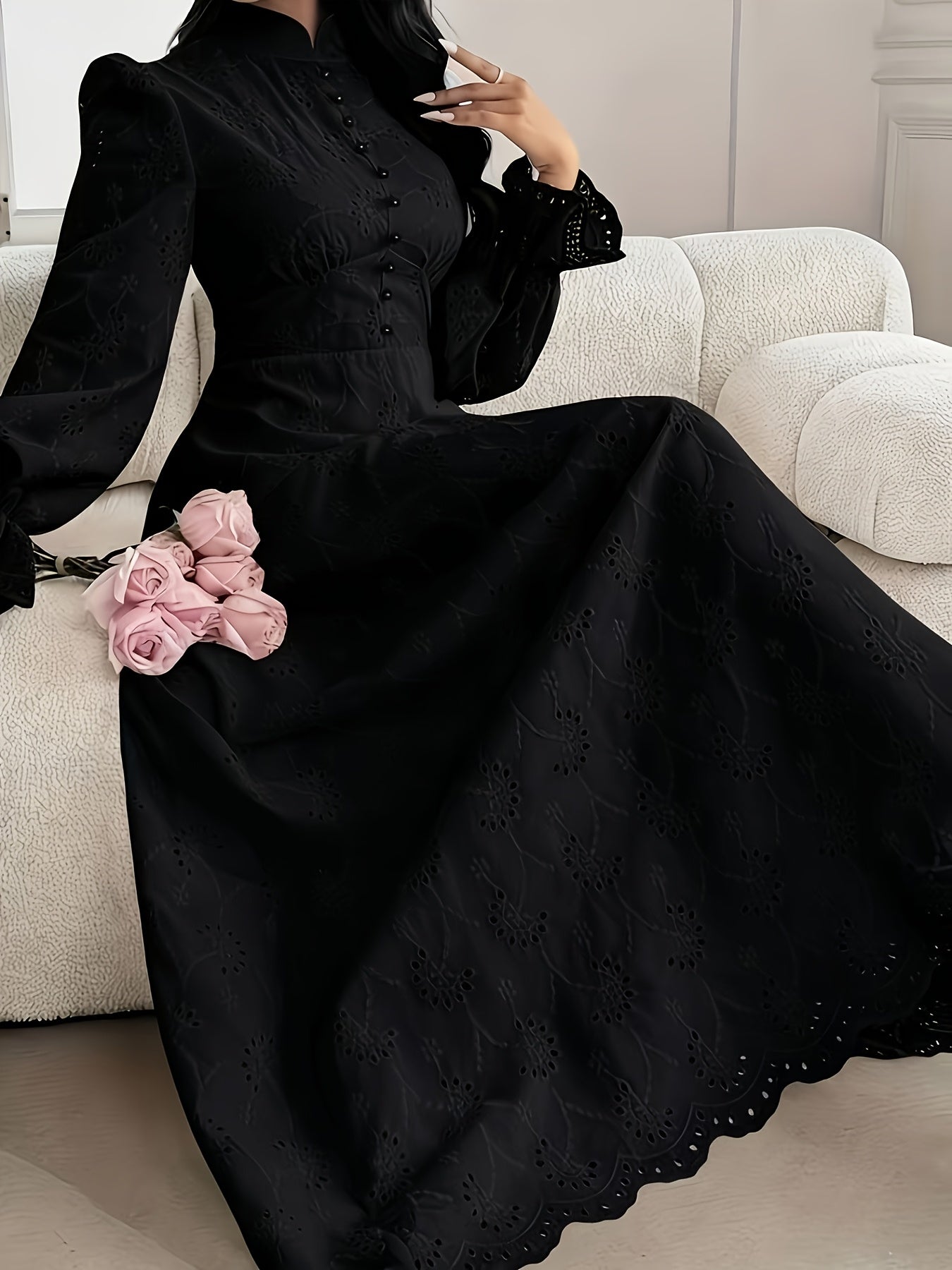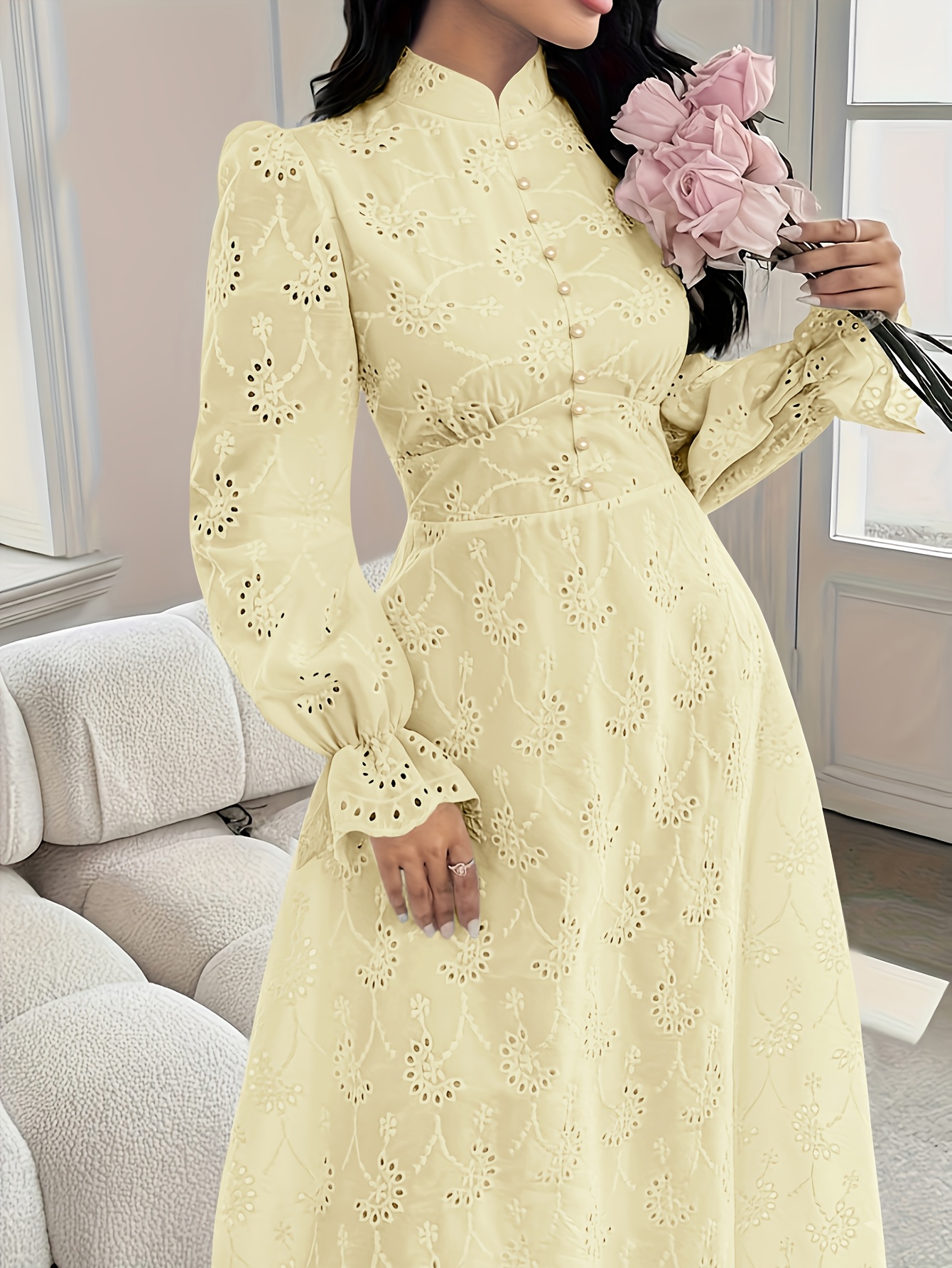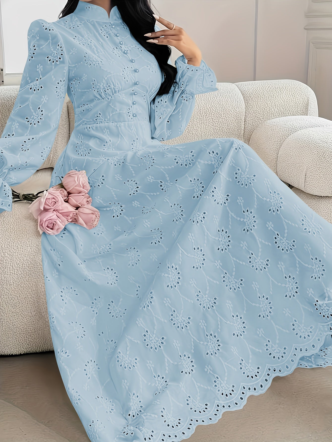 Women'S French Embroidered Stand Collar Puff Sleeve Dress Featuring a Ruffled Design, Suitable for Dates, Vacations, Parties, And Everyday Commuting.