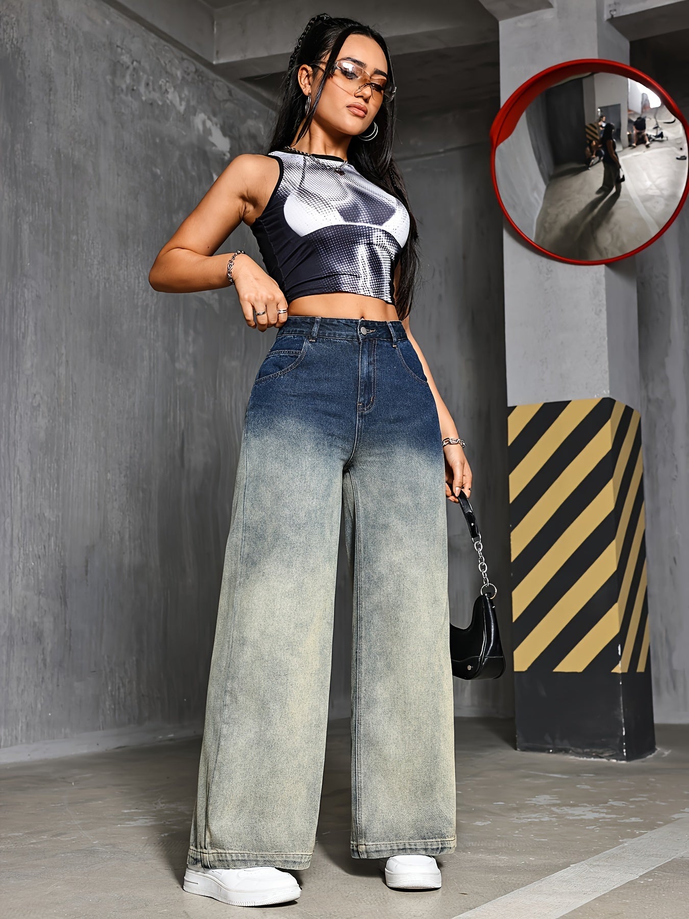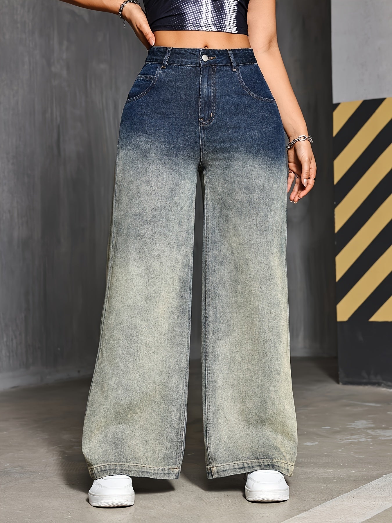 Jeans Femme Taille Haute Dégradé Jambe Large Style Street Bootcut Poches Boutons Toute Saison Confort Décontracté