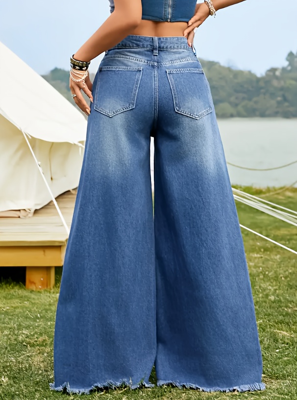 Jean femme taille haute – coupe large décontractée, denim bleu classique, bords effilochés, style élégant pour travail et tenue casual