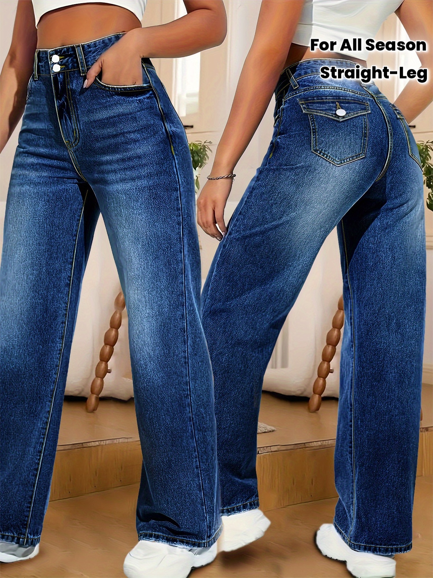 Jeans Femme Taille Haute Jambe Droite Extensible Élégant Double Boutons Toute Saison Longue Décontracté et Formel Slim Lavable