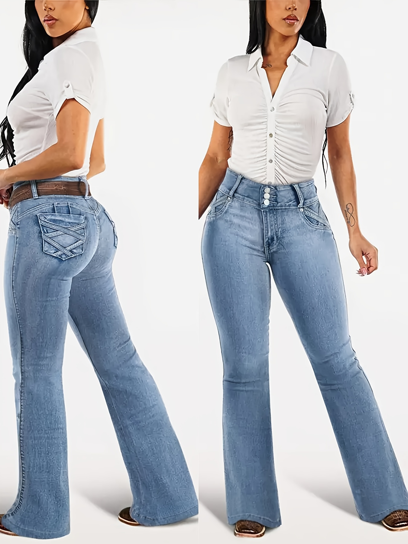 Jean évasé taille haute pour femme - Pantalon bleu délavé avec passants de ceinture et fermeture éclair, coupe slim gainante