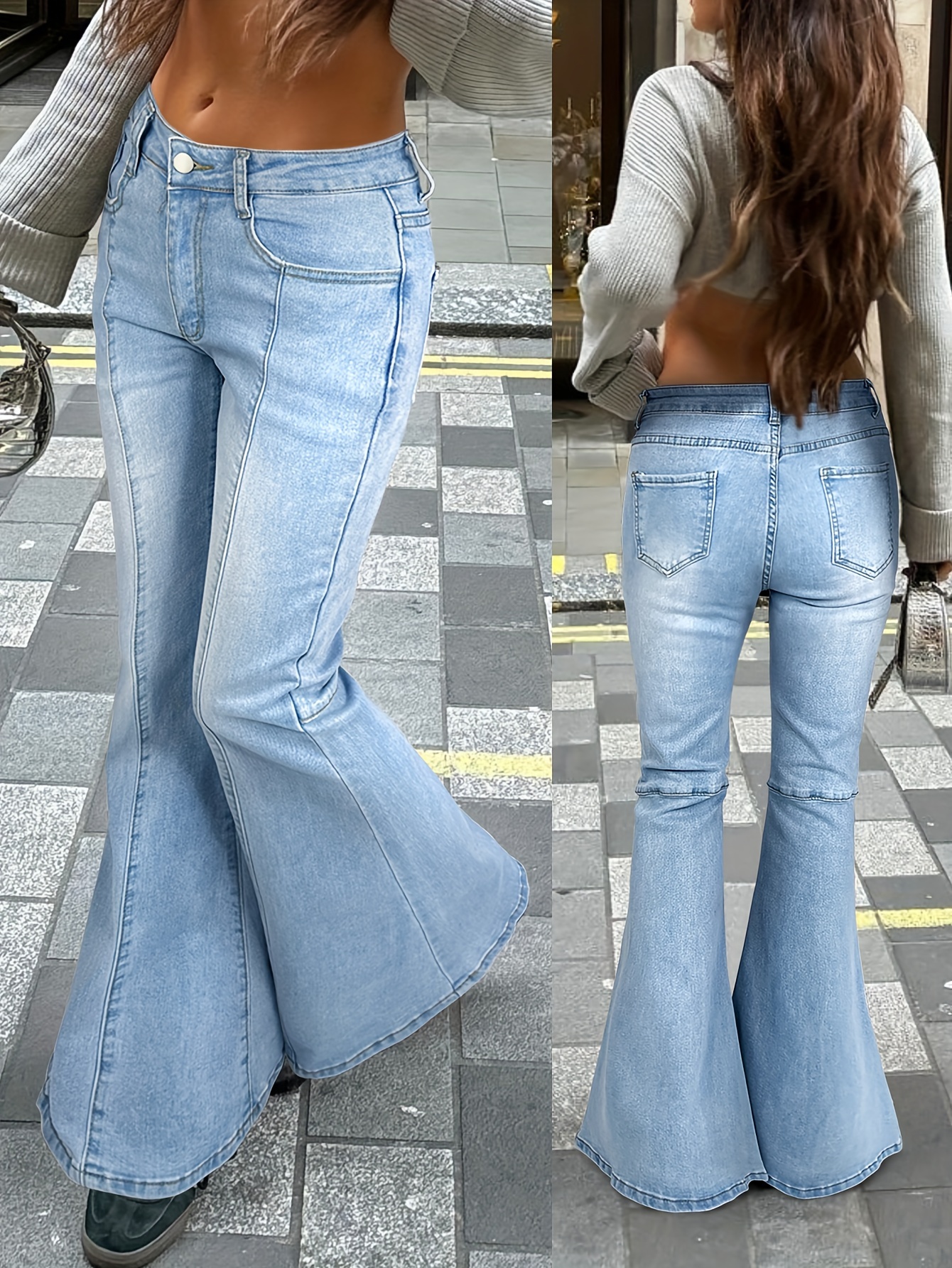 Jean évasé bleu clair pour femme - Taille mi-haute, denim stretch avec poches en biais, coupe décontractée et confortable, effet dégradé