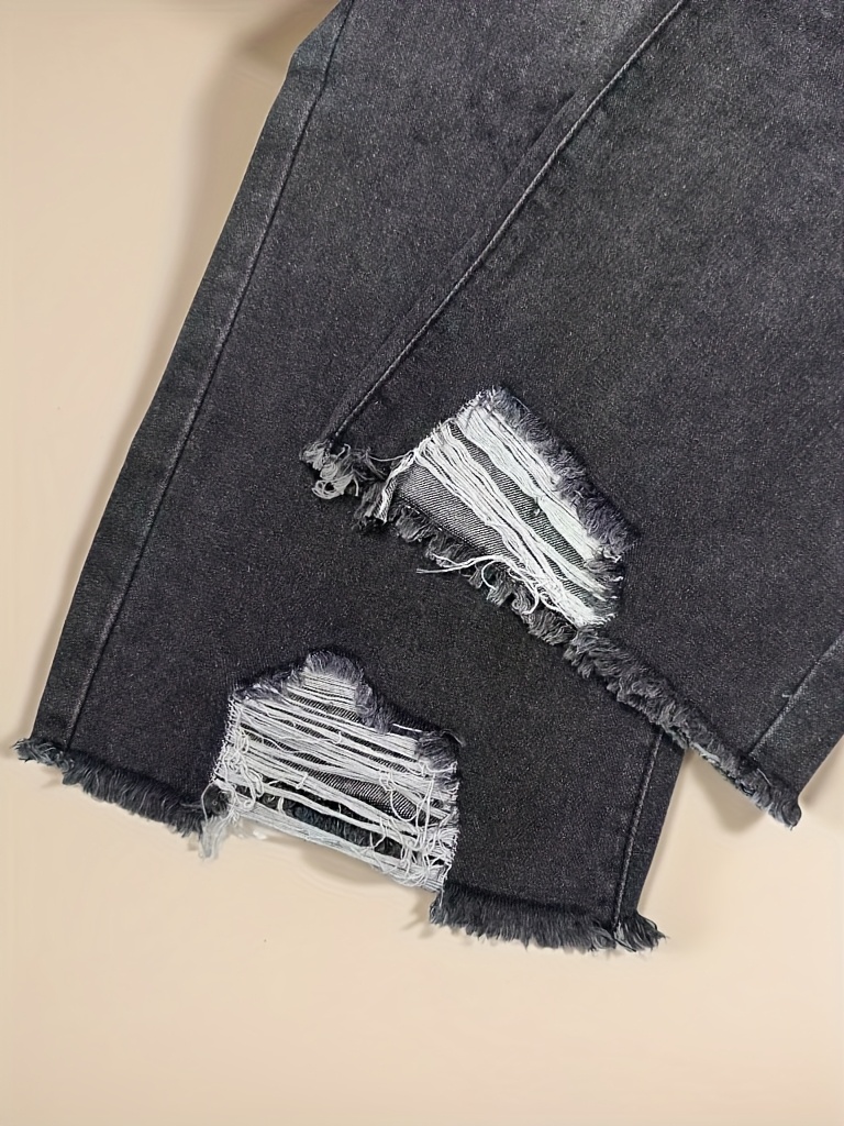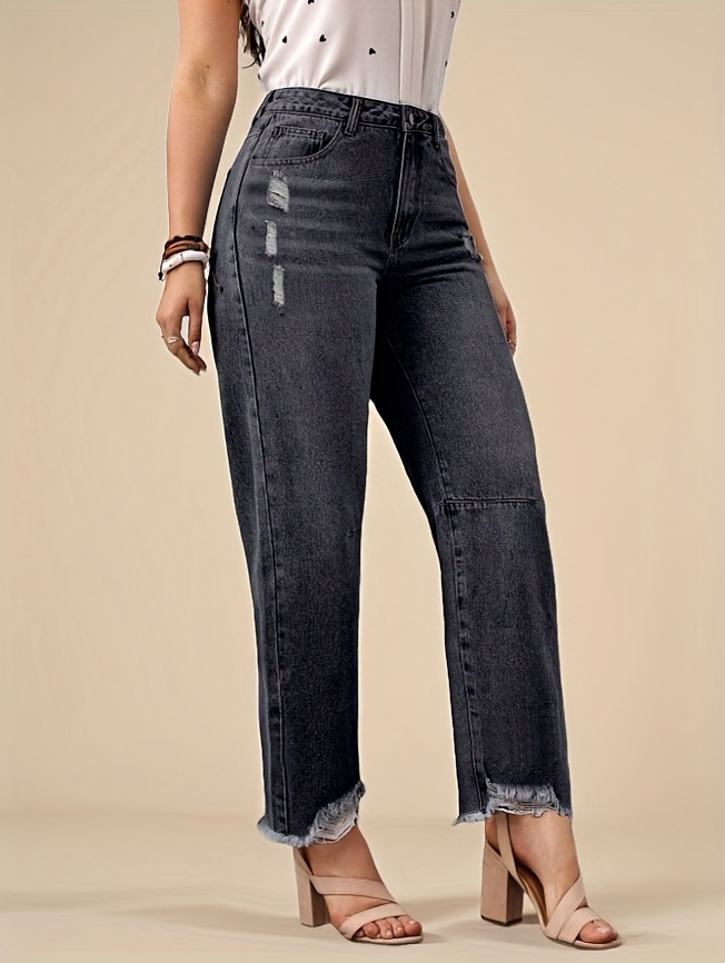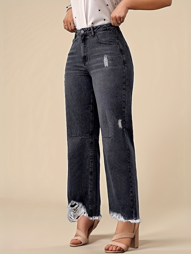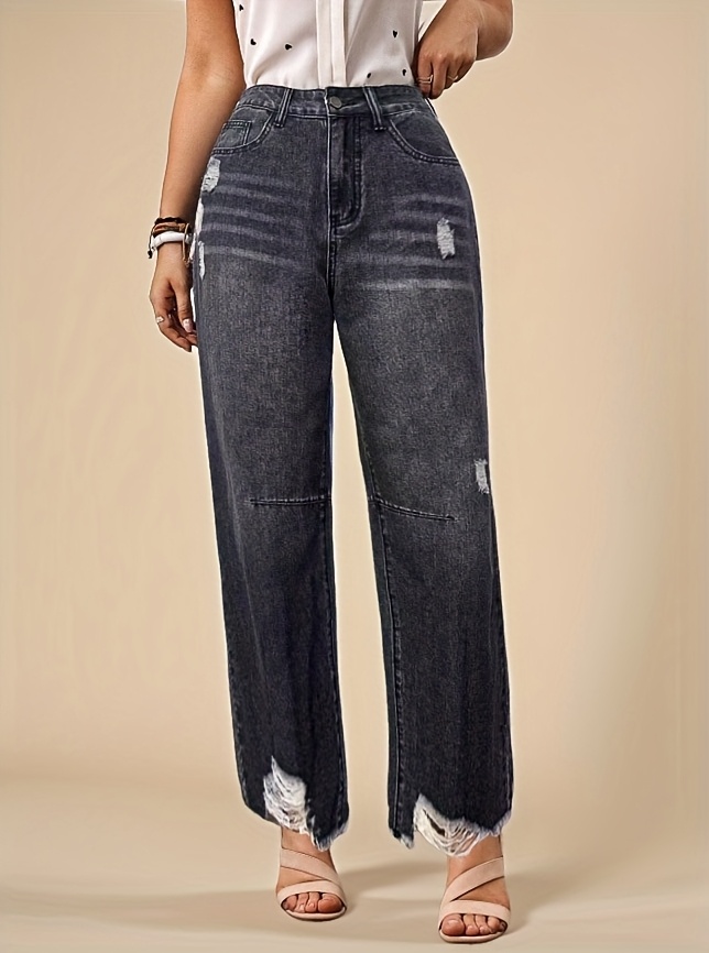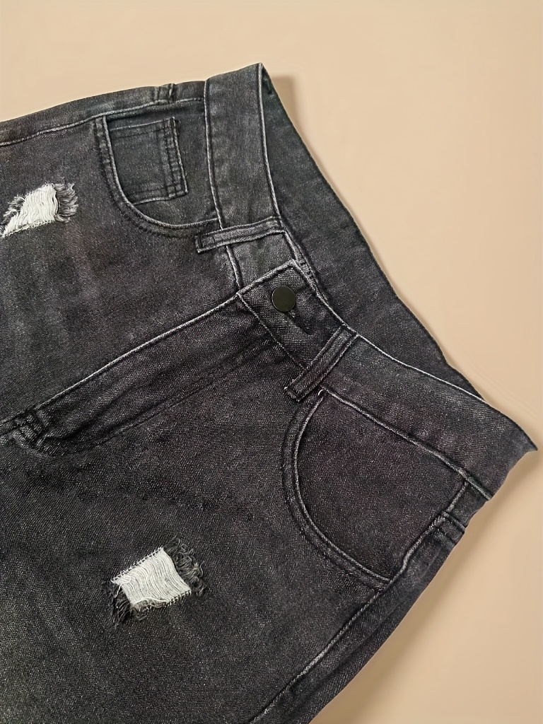 Jean en denim délavé non extensible pour femme - Coupe slim, taille mi-haute, poches obliques, ourlet déchiré avec revers usés et fermeture éclair intégrée, en tissu noir délavé