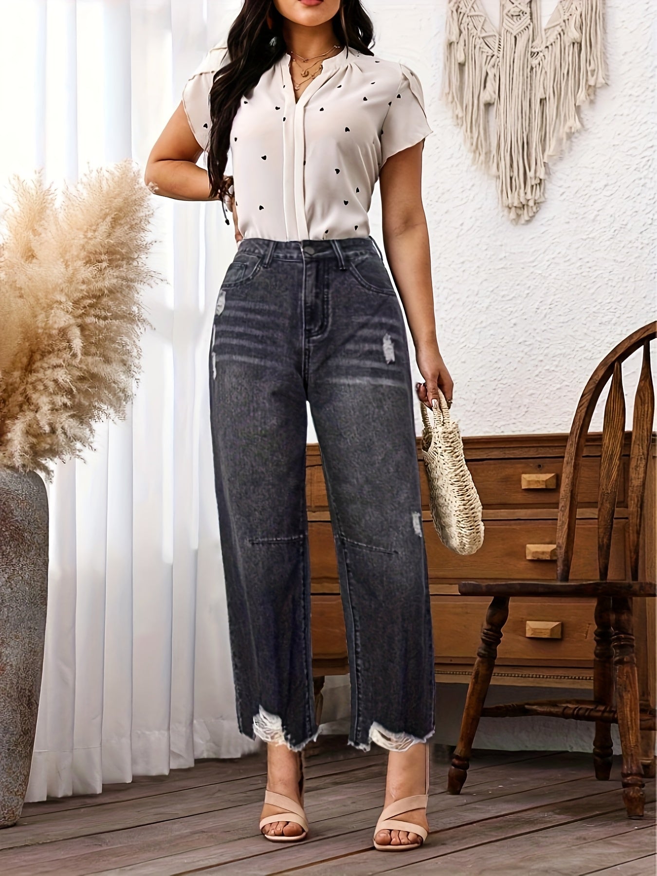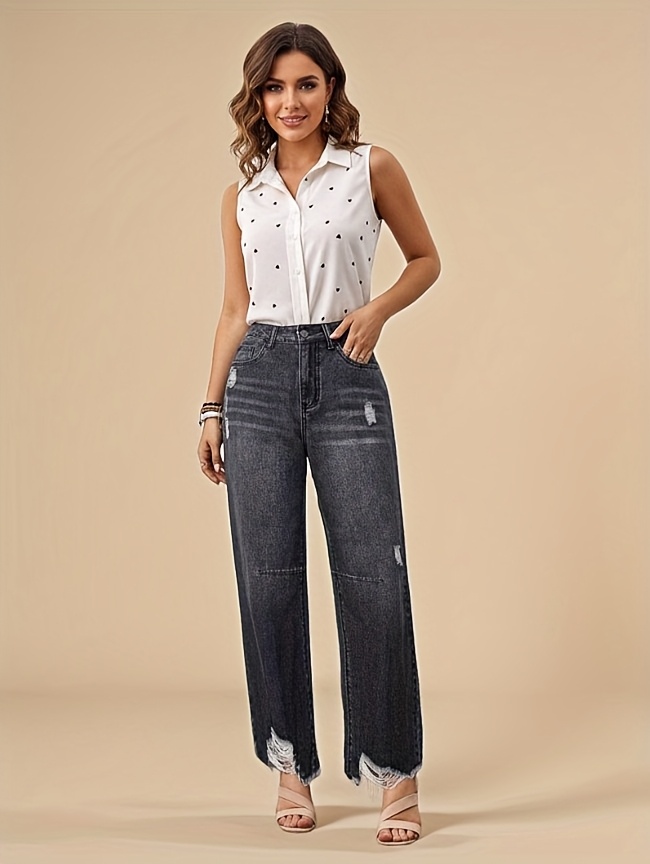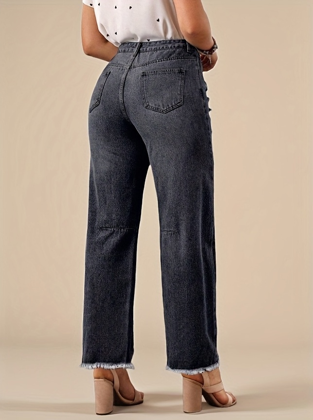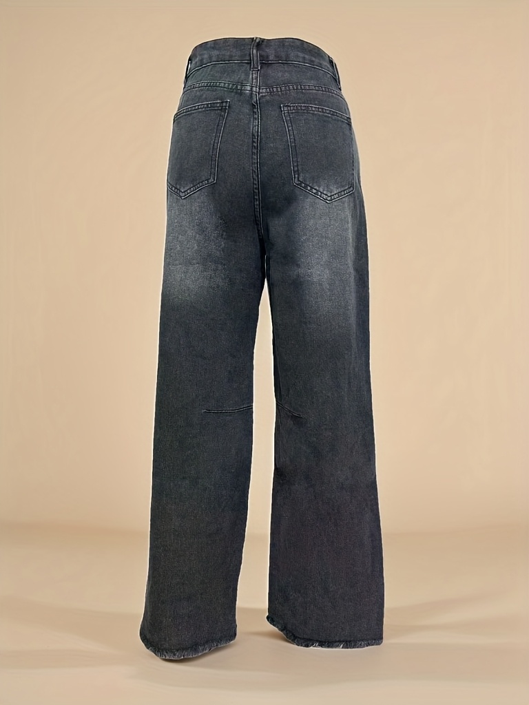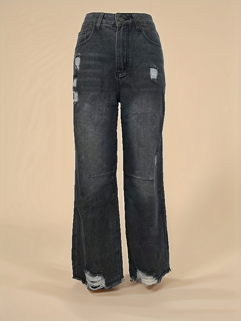 Jean en denim délavé non extensible pour femme - Coupe slim, taille mi-haute, poches obliques, ourlet déchiré avec revers usés et fermeture éclair intégrée, en tissu noir délavé