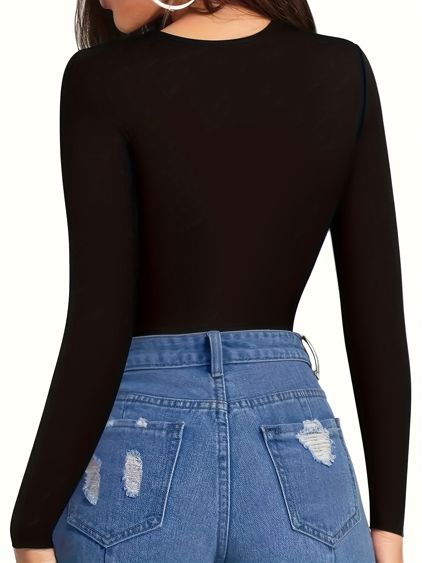 Combinaison moulante femme à manches longues, coupe ajustée avec contrôle du ventre, tissu extensible, couleur noire, col rond, taille haute, idéale pour un look décontracté ou habillé