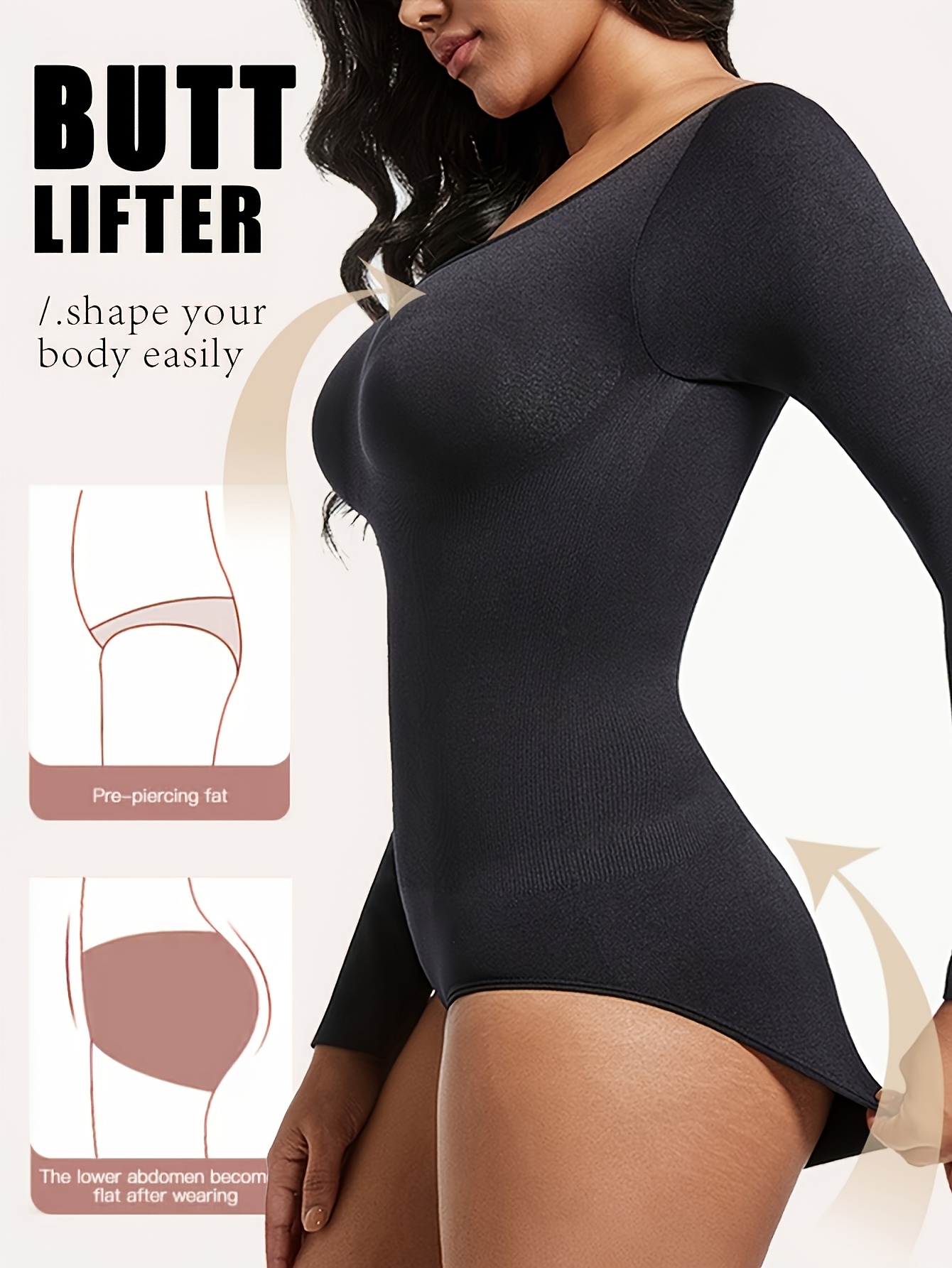 Body Femme Sexy Manches Longues – Col Rond, Taille Haute, Sans Coutures, Dos Nu Col Carré, Combinaison Short Mi-Cuisse, Idéal Fitness Printemps/Été, Tissu Lisse, Polyvalent
