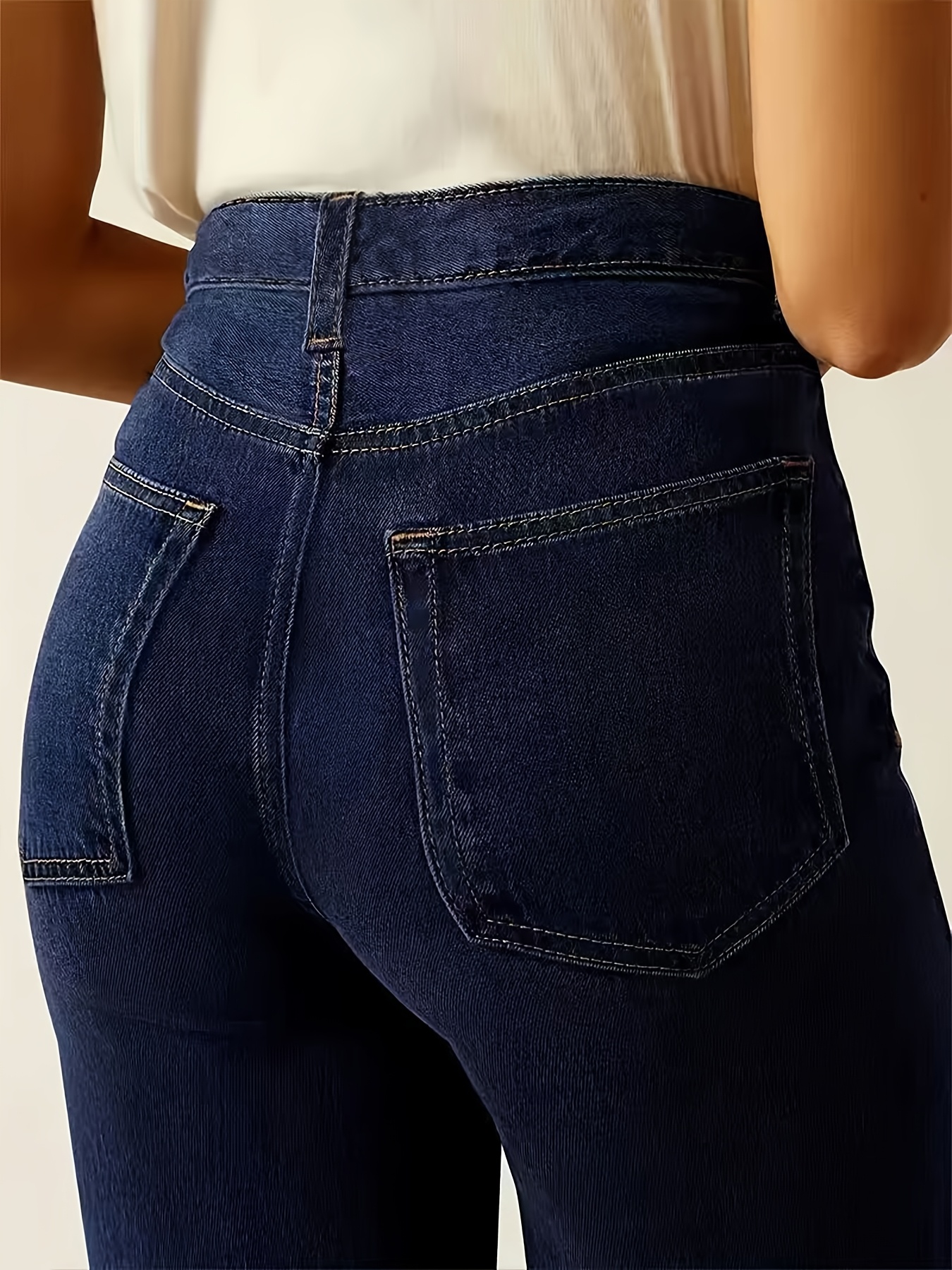 Jeans Femme Jambe Large Extensible Non Transparent Bleu Foncé Effet Usé Zippé Toute Saison Polyvalent Élégant
