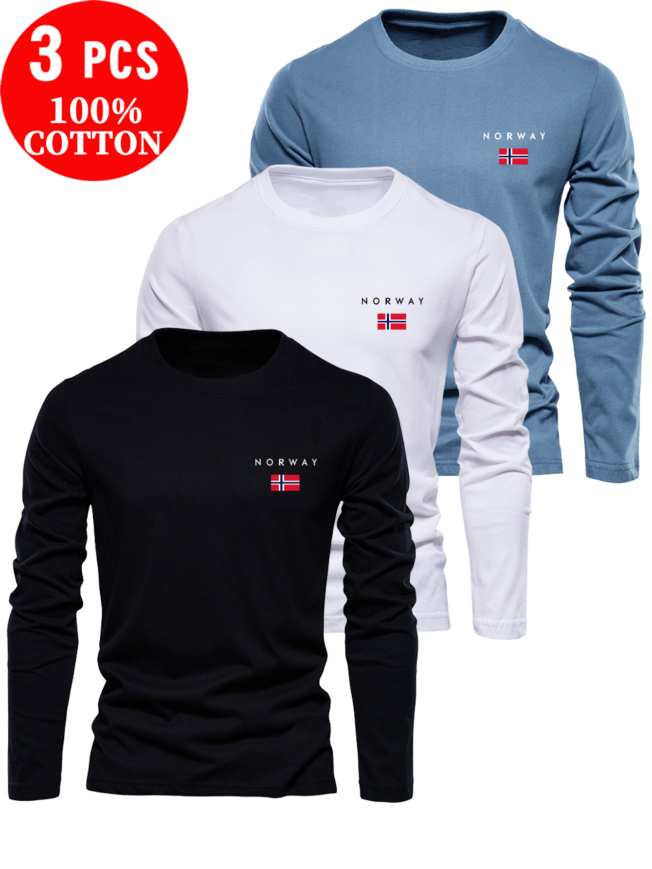 3-Pack 100% Cotton T-Shirts, Men's Round Neck Spring/Autumn New Minimalist Long Sleeve Casual Tees for Daily Wear and Outdoor Activities
