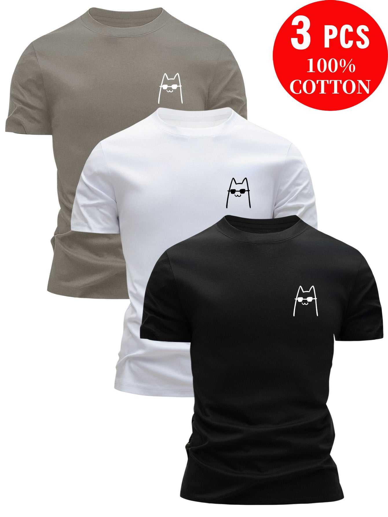 3pcs 100% Cotton T-Shirts, Funny Summer Casual Top for Men with Cartoon Cat Design, Leisure Clothing, Relaxed Fit, Cartoon Print, Playful Design, Cotton Fabric, Comfortable Fit, Short Sleeve Tee, Fitted Shirt, Casual Wearers,