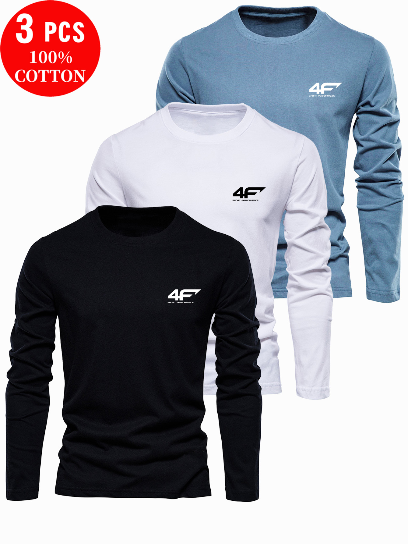 3pcs 100% Cotton T-Shirts, New Fashion Spring/Autumn Casual Long Sleeve Men's Printed Tee Stylish Base Layer Shirt for Outdoor and Casual Attire