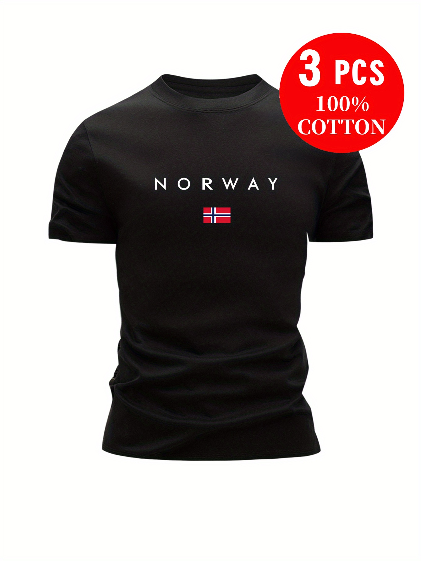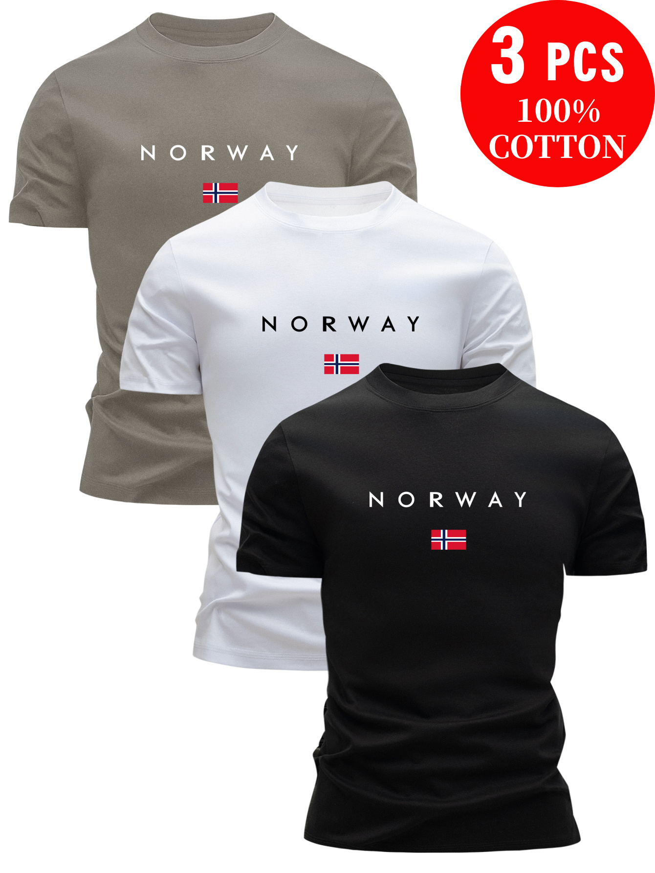 3pcs Men'S 100% Cotton Slim Fit T-Shirts - Breathable & Sweat-Wicking Summer Casual Tees with NORWAY Letter Print, Round Neck Short Sleeve, Light Blue/White/Black, T-shirt Stylish, Comfortable Clothing, Minimalistic Design, B