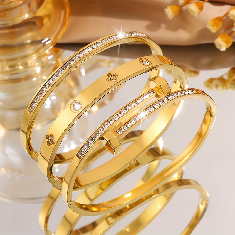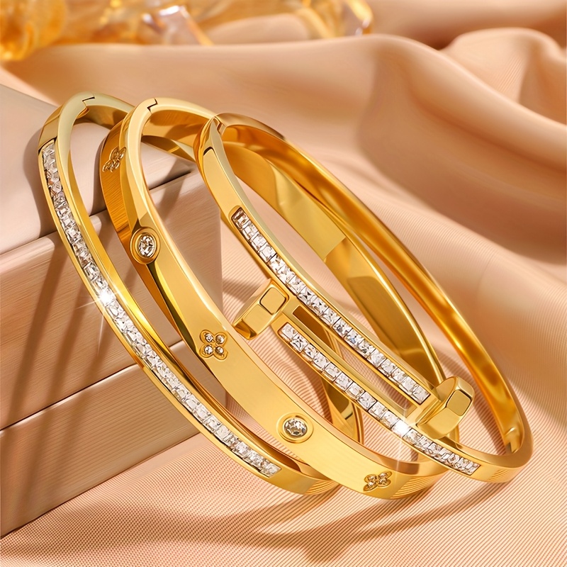 Lot de 3 bracelets en acier inoxydable de luxe léger, sertis de zircon synthétique, design exquis et classique, polyvalents, adaptés à toutes les occasions