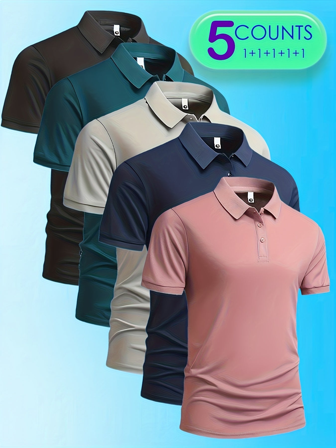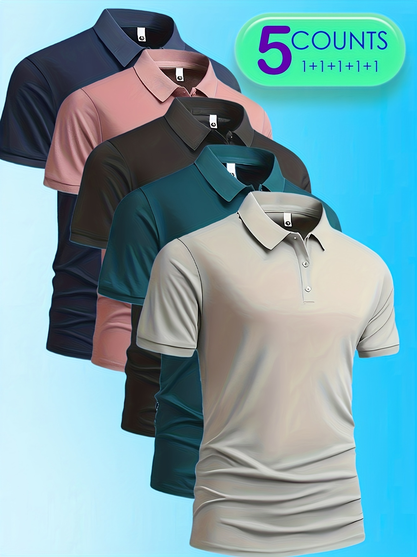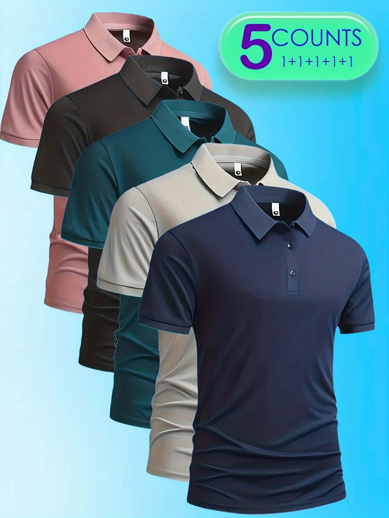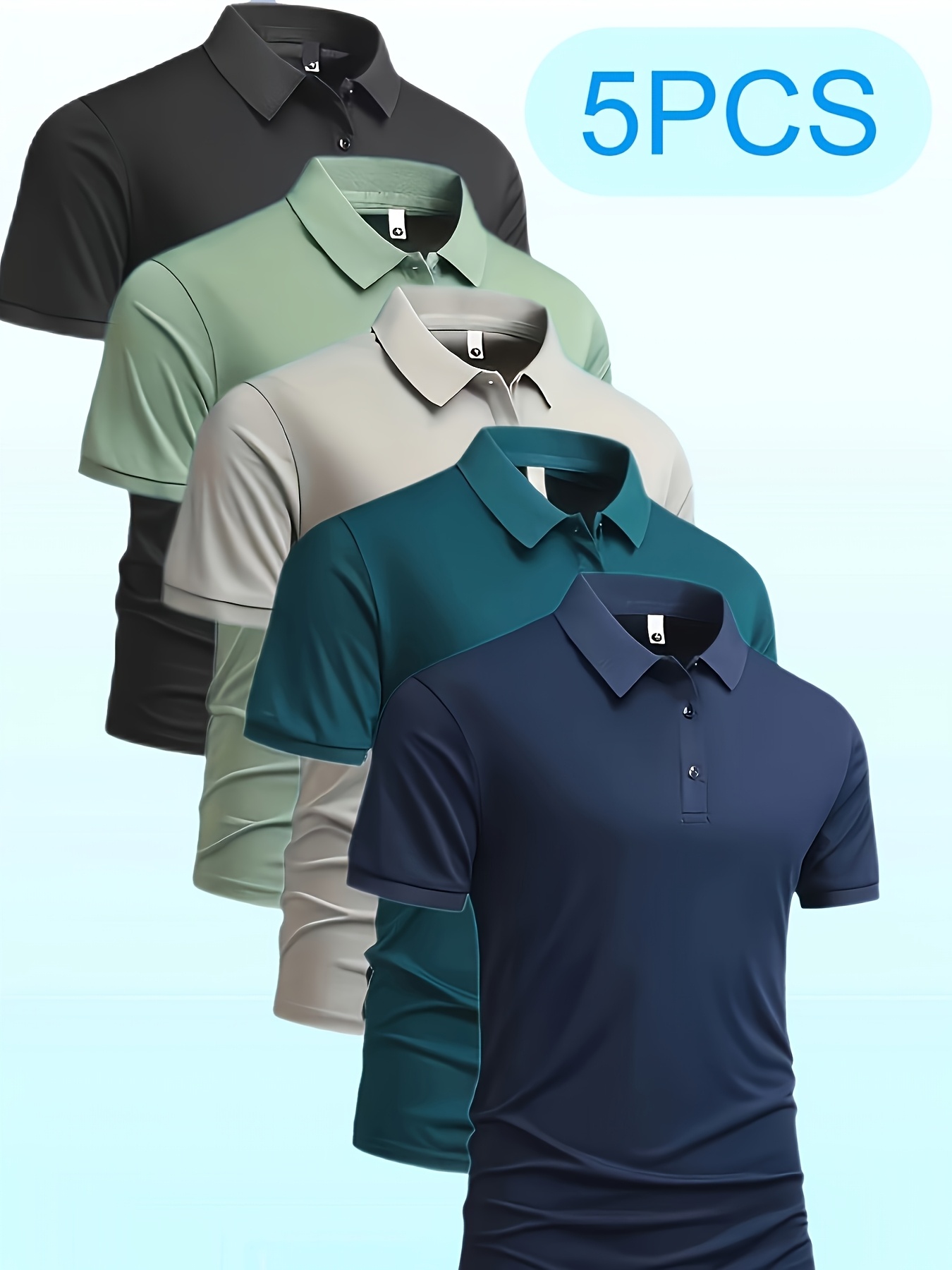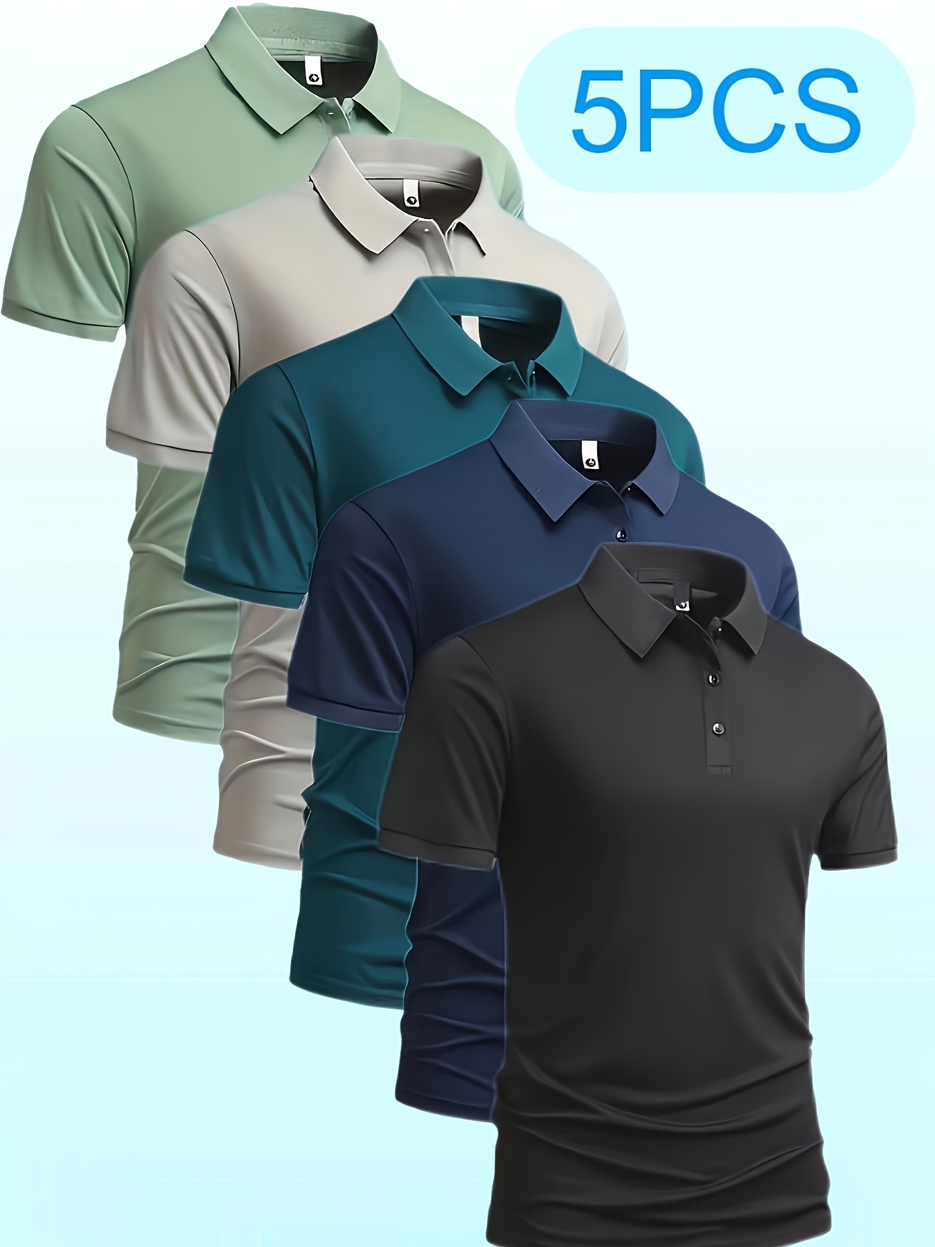 5pcs Men'S Polo Shirts - Elegant Solid Color, High-Quality Fabric, Short Sleeve, Button-Up Collar, Regular Fit, All-Season Wear for Business, Travel, Work, Dates, Home & Golf, Golf Attire | Stylish Polo Set | Durable Fabric