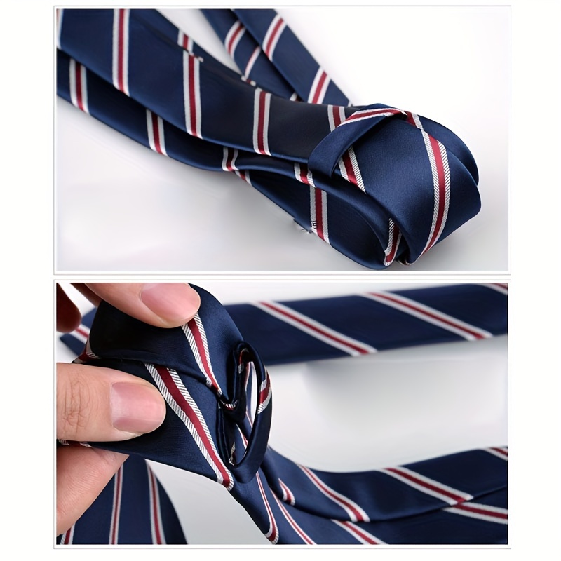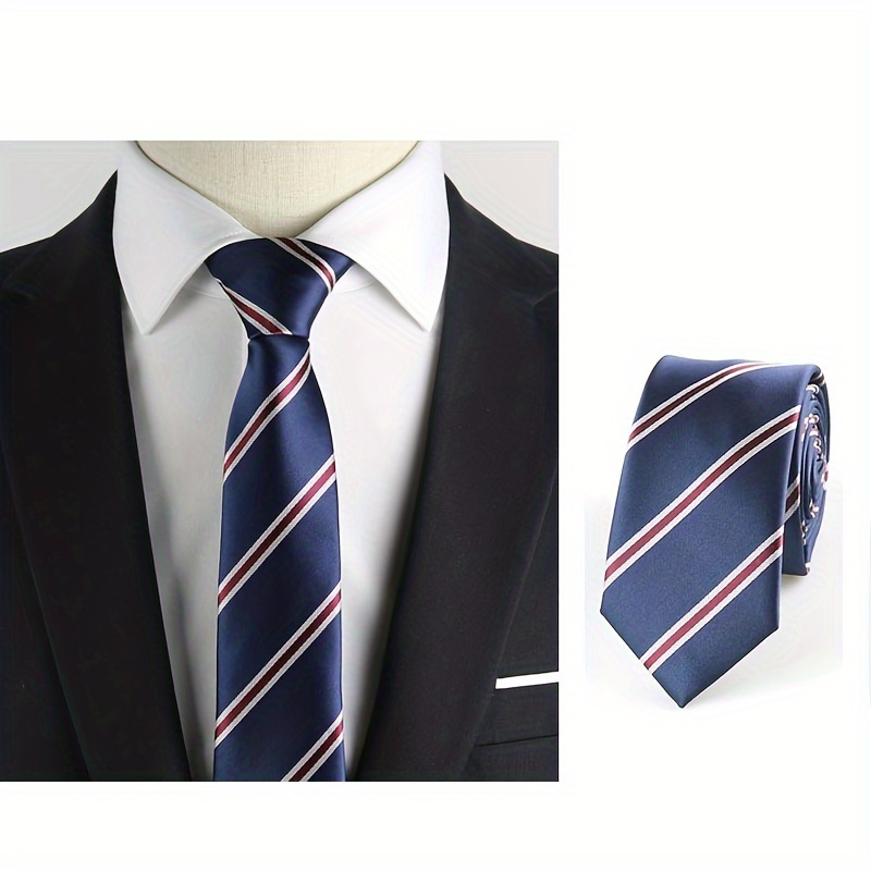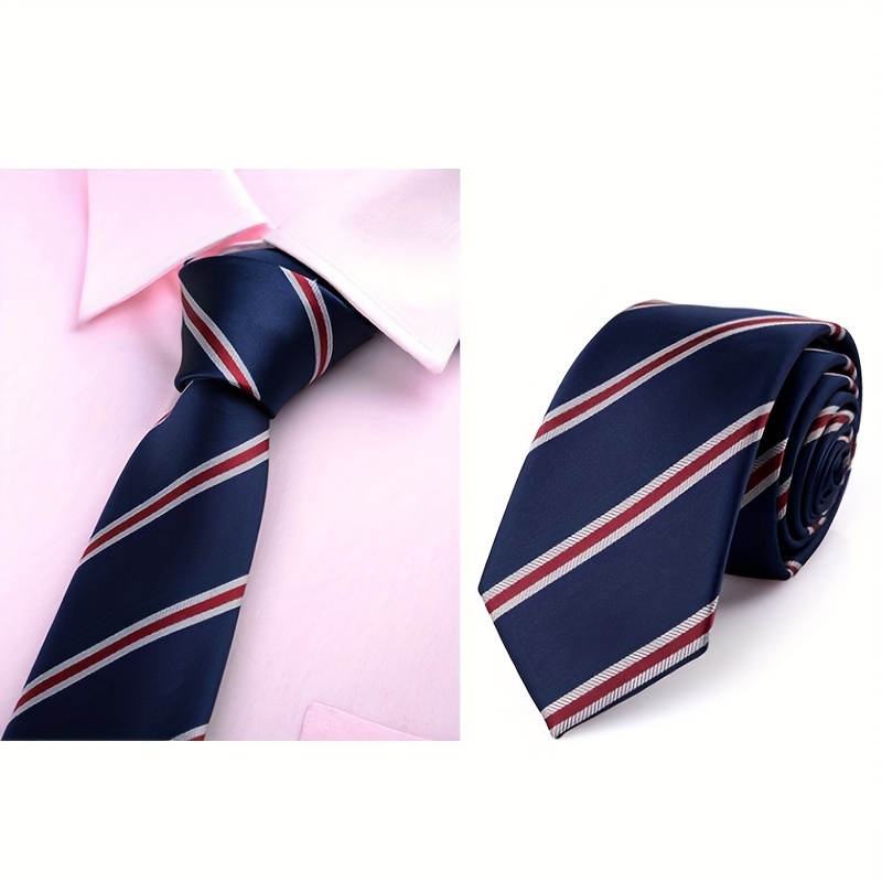 Matching for Specific Styles: The cherry red, white, and blue color-block striped tie shown in the picture is a perfect match for all your blue and linen blazers. It balances both texture and practicality.