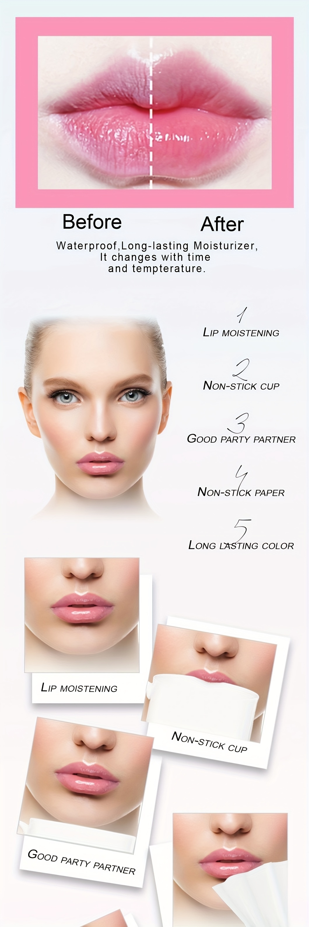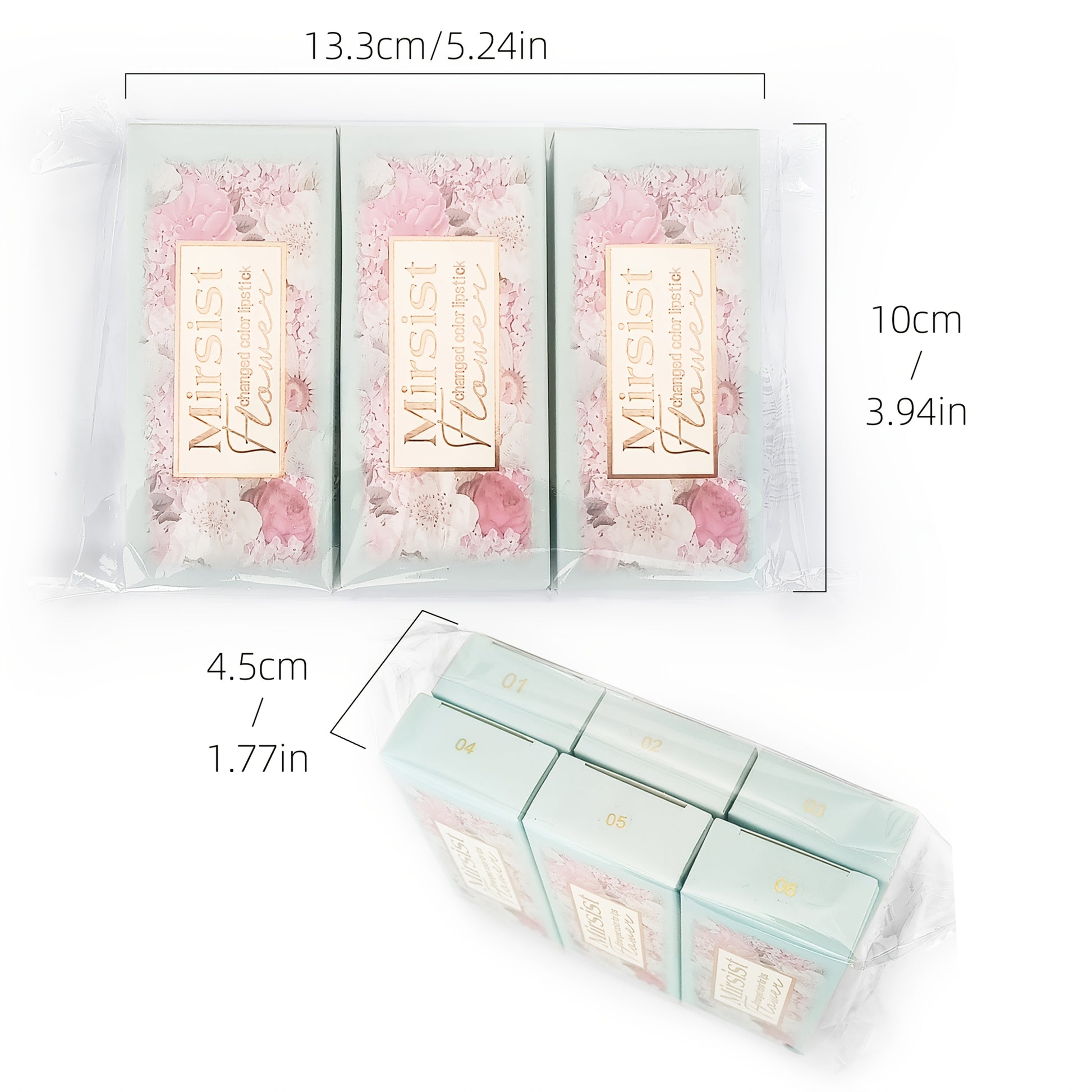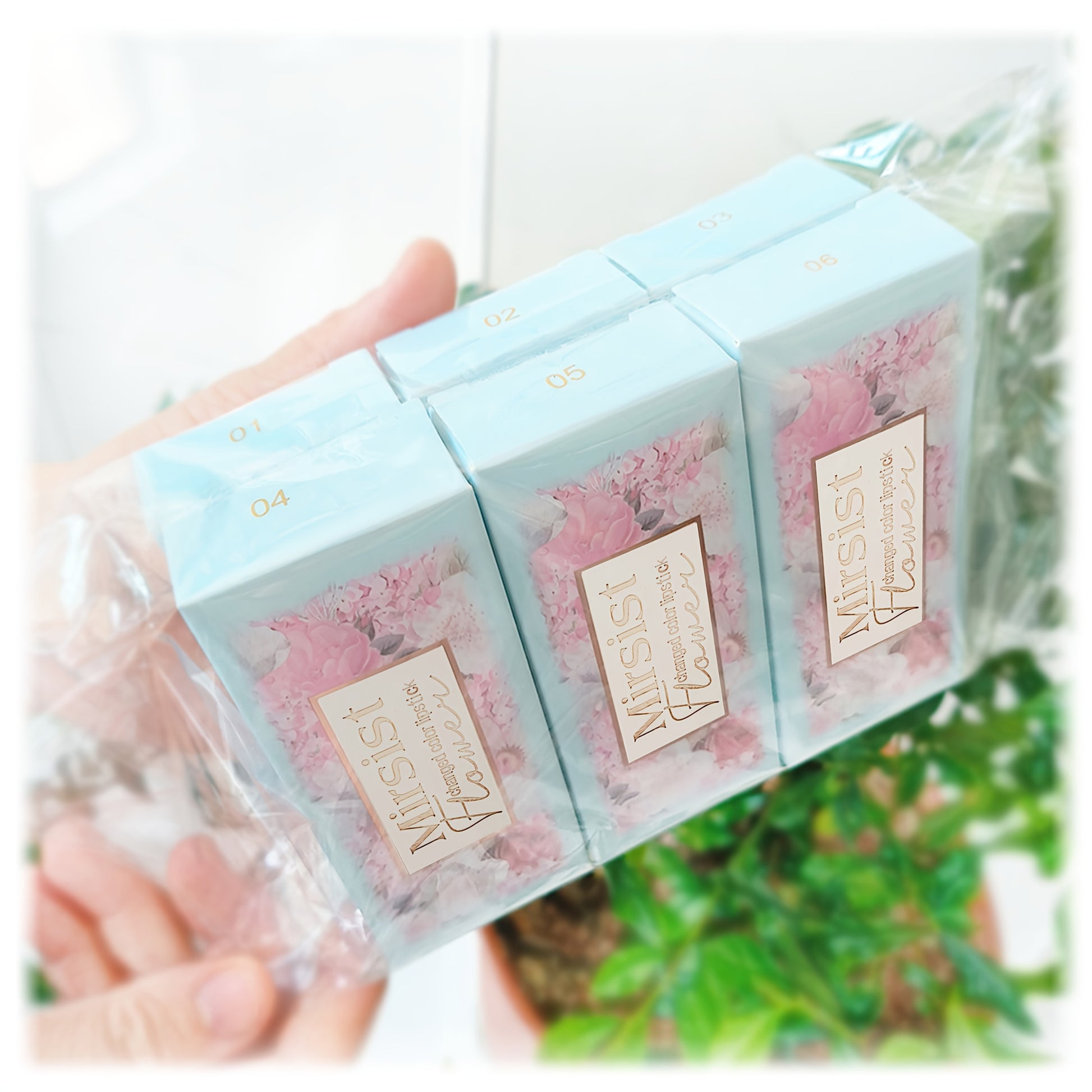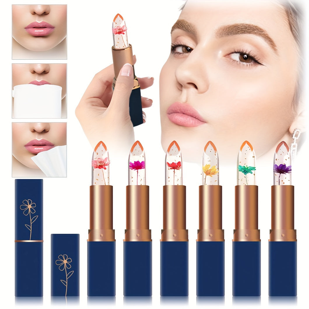 Lot de six baumes à lèvres, six en un, à la couleur changeante, conditionnés dans des sachets OPP. Ce baume à lèvres transparent devient rose