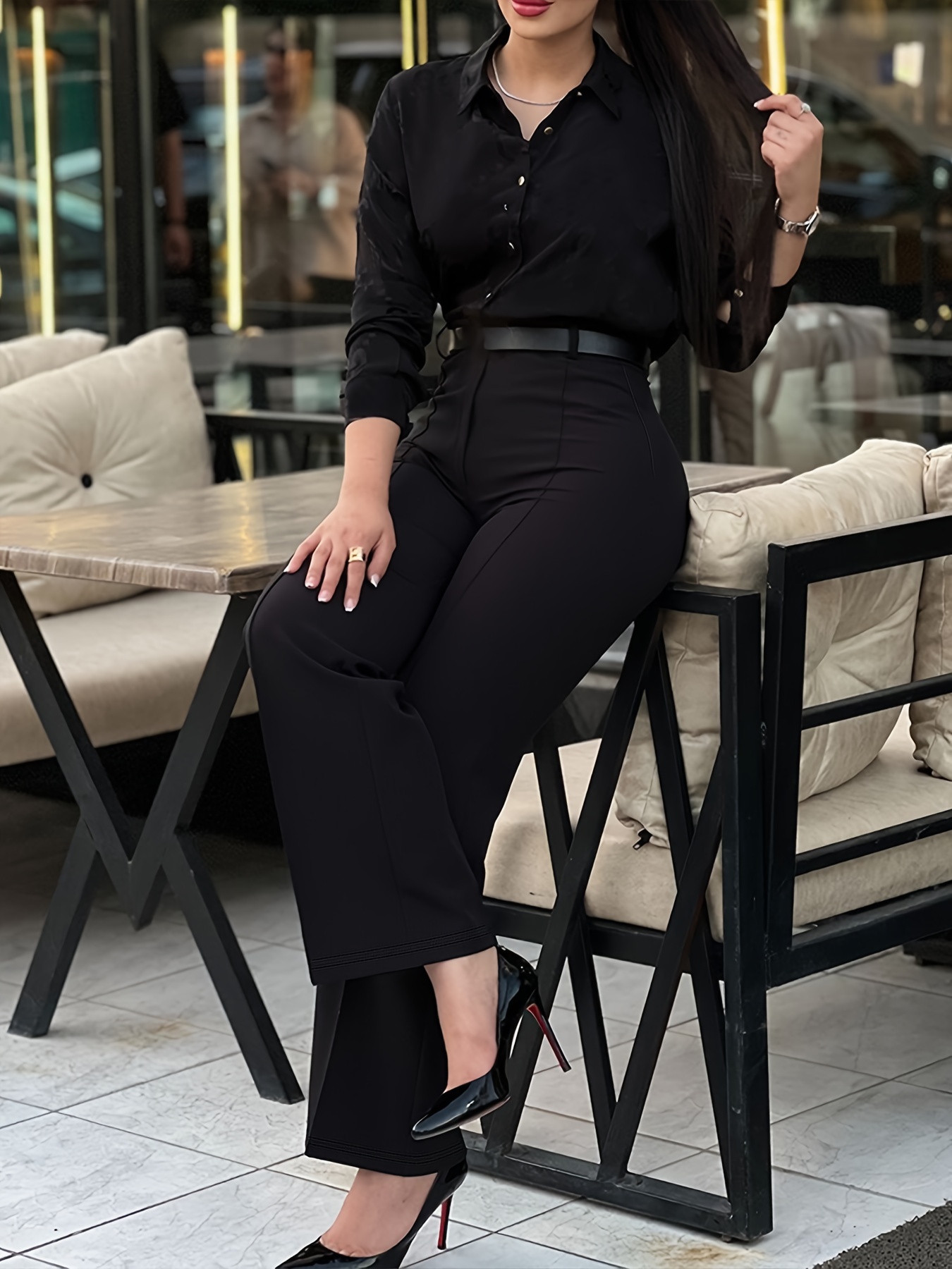 Pantalon Femme Taille Haute – Costume Noir Élégant, Jambe Droite, Polyester, Tous Saisons