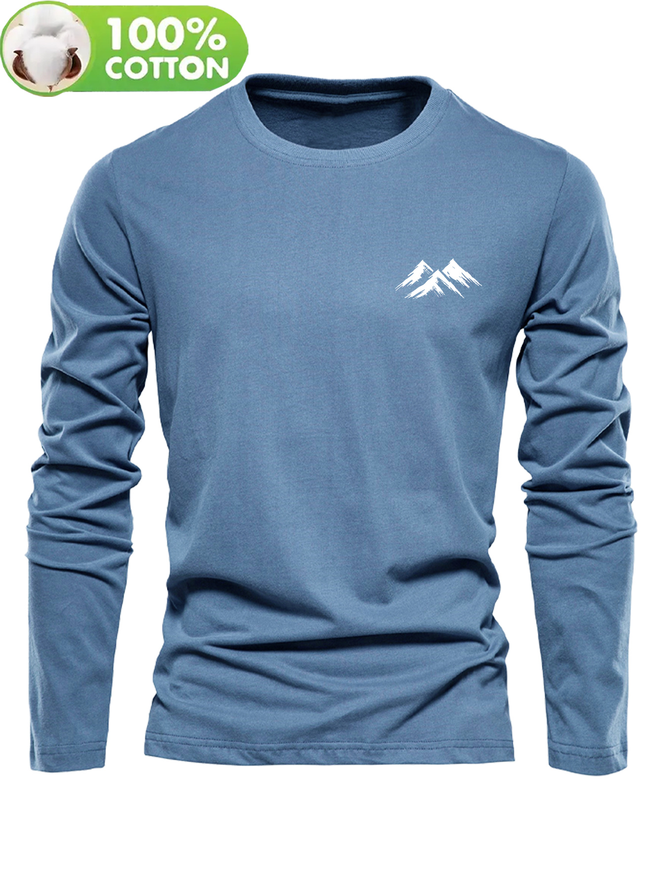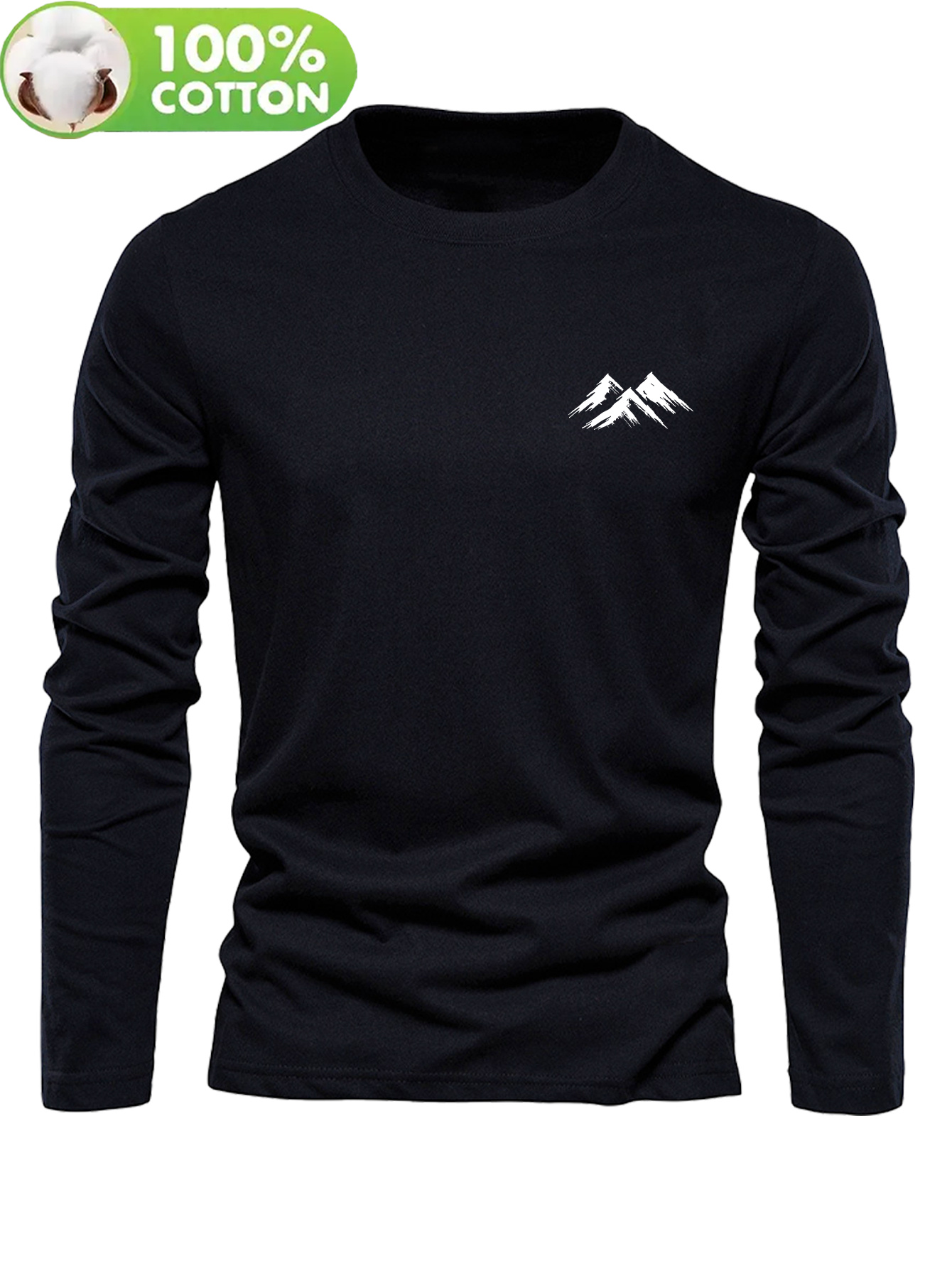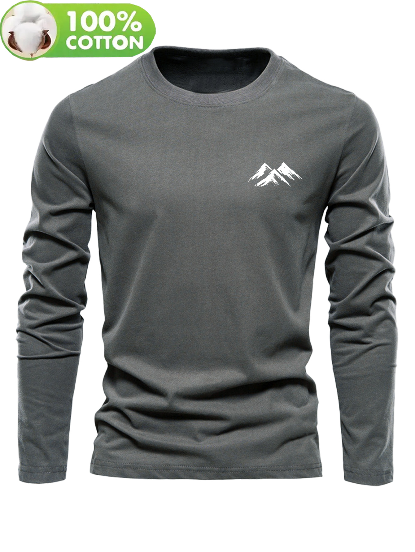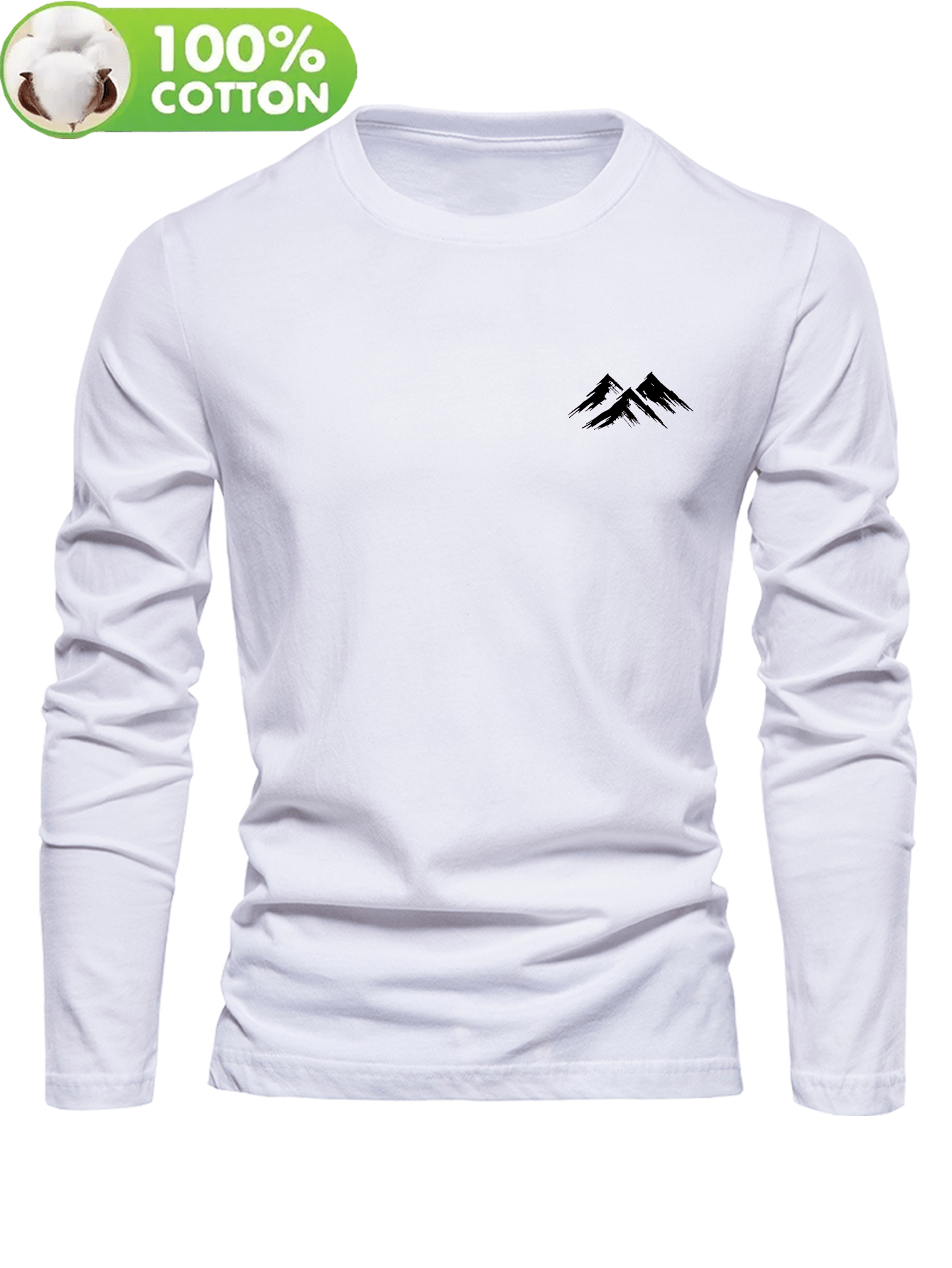 Men's 100% Cotton Long Sleeve T-Shirt with White Mountain Logo Print - Casual Round Neck Pullover, Thick Short-Season Layering Top for & Casual Attire, Spring/Fall Wardrobe Essential (Regular Fit, Hand Washable) - 100% Breath