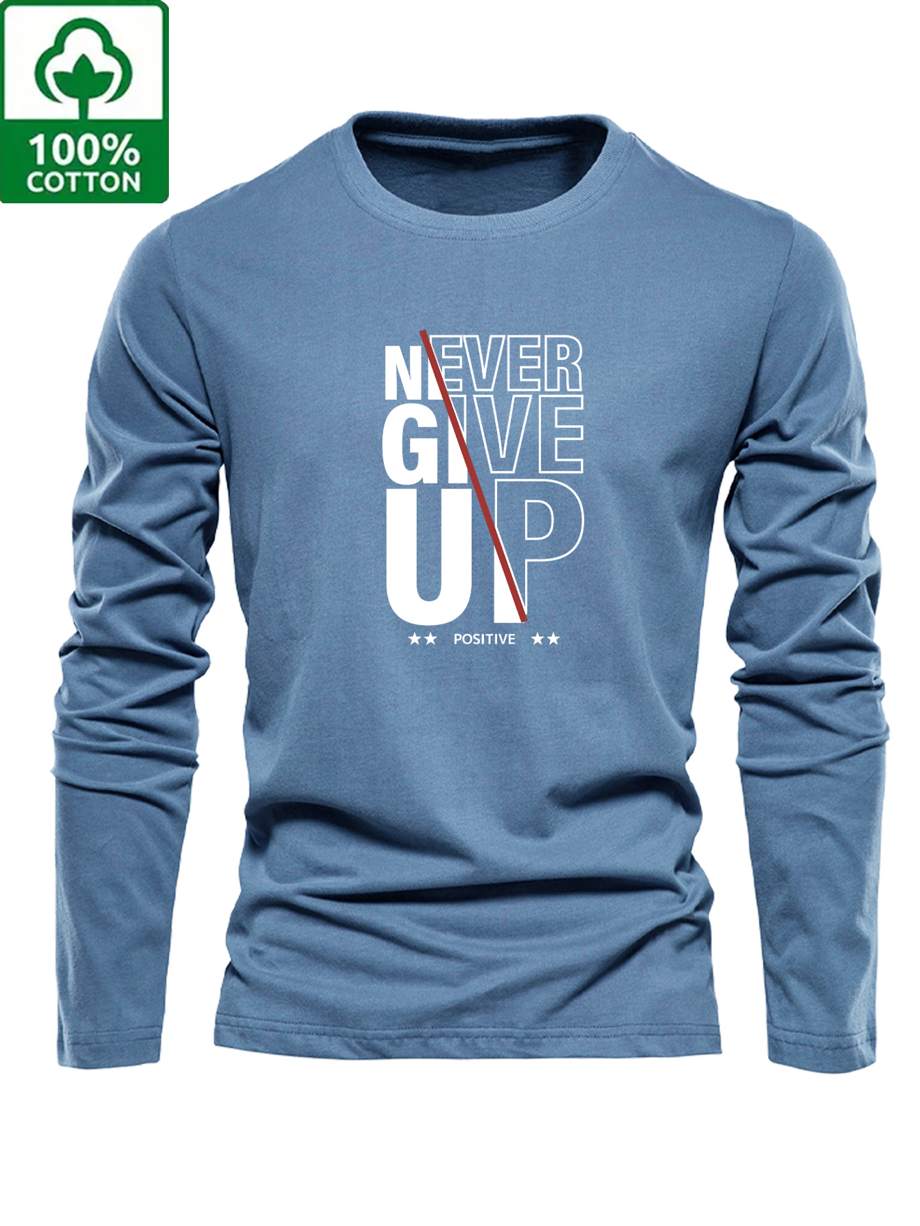 Men's 100% Cotton Oversized Long Sleeve T-Shirt with Never Give Up Slogan & Text - Motivational Lettering Print Casual Round Neck Top for Spring/Fall, Casual Attire (Grey) - 100% Cotton Fit