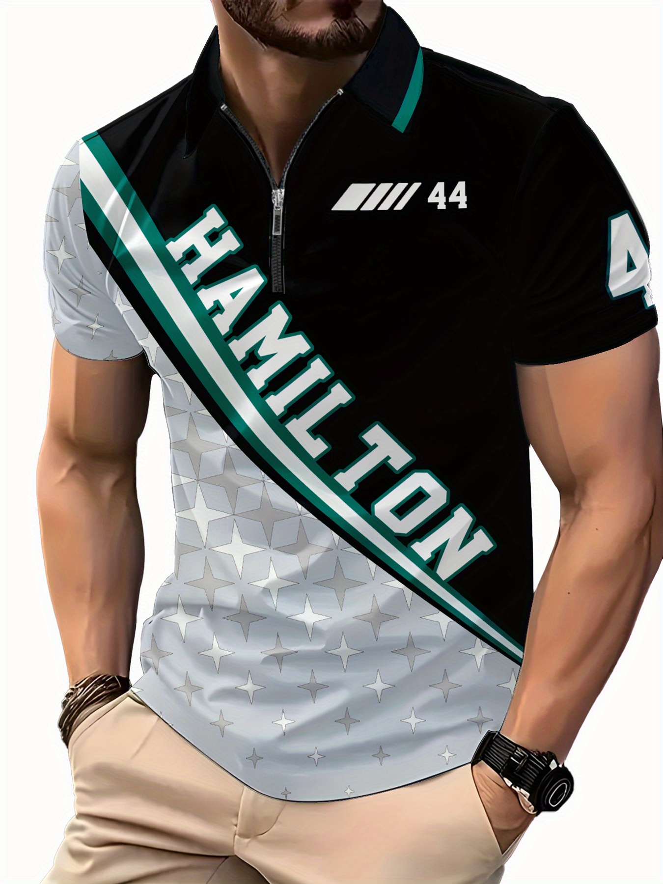 Men's 3D Digital Print Racing Shirt - Summer Short Sleeve with Zipper Collar, Striped Design & Bold '44' Graphic, Breathable Machine-Washable Fabric for Casual & Sporty Style, Summer Outfit, Comfortable Fit
