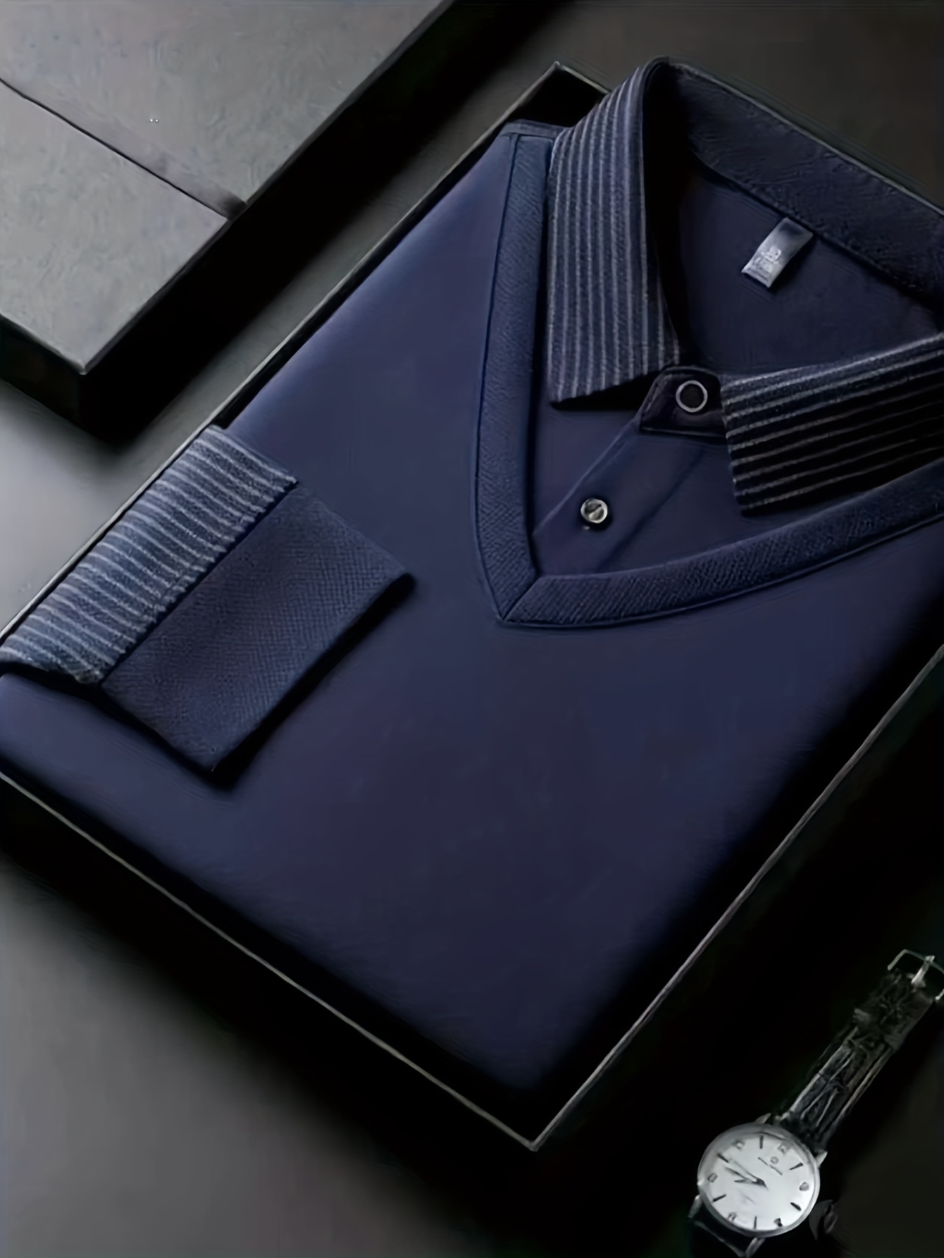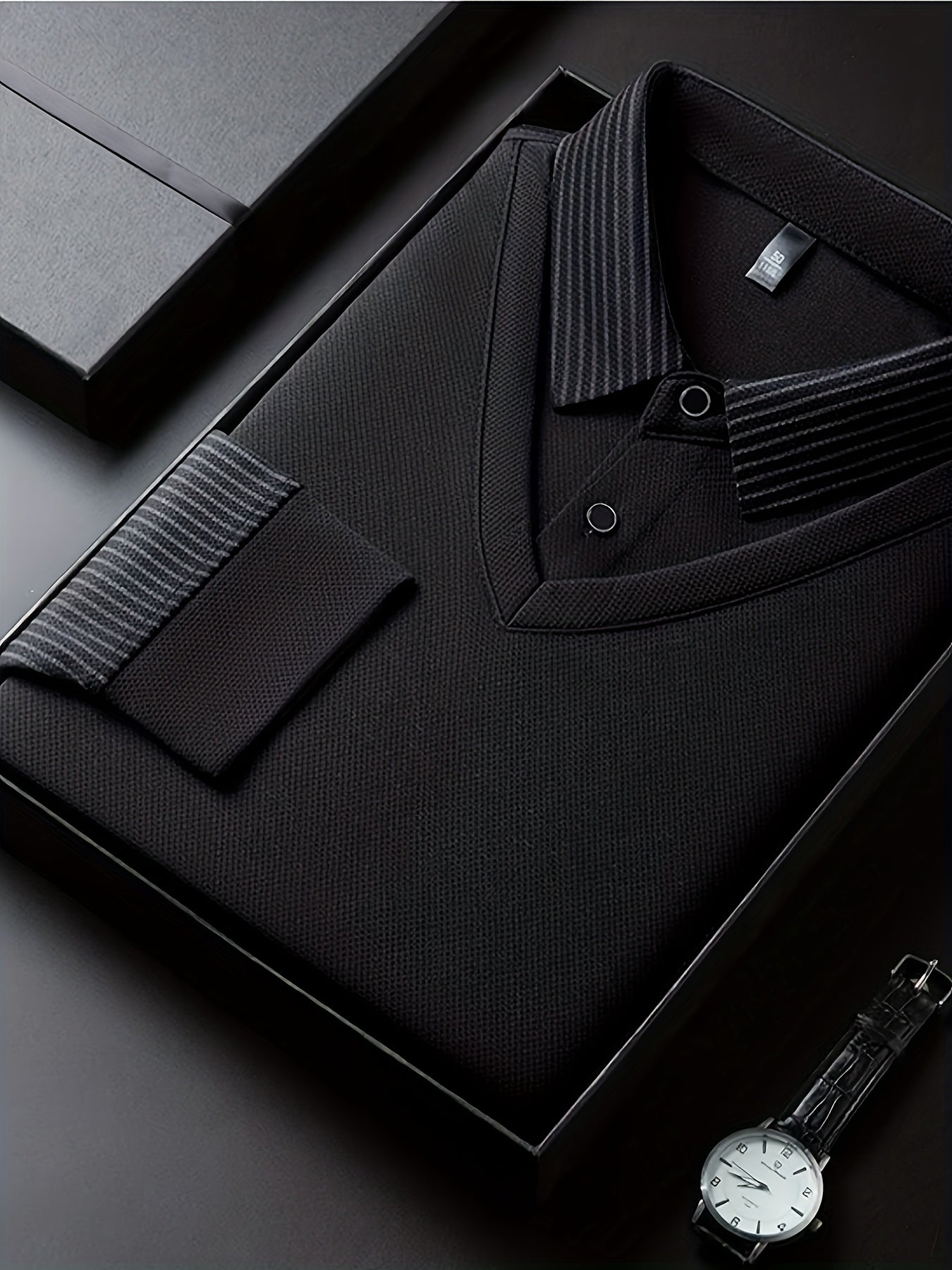 Men'S Faux Two-Piece Shirt Collar Knitwear, a Business Casual Striped Patchwork Top Featuring a Milano Letter Print Design, Available in Various Colors. It Has a Gray And Golden Contrasting Collar And Cuffs, a Simple Solid Co