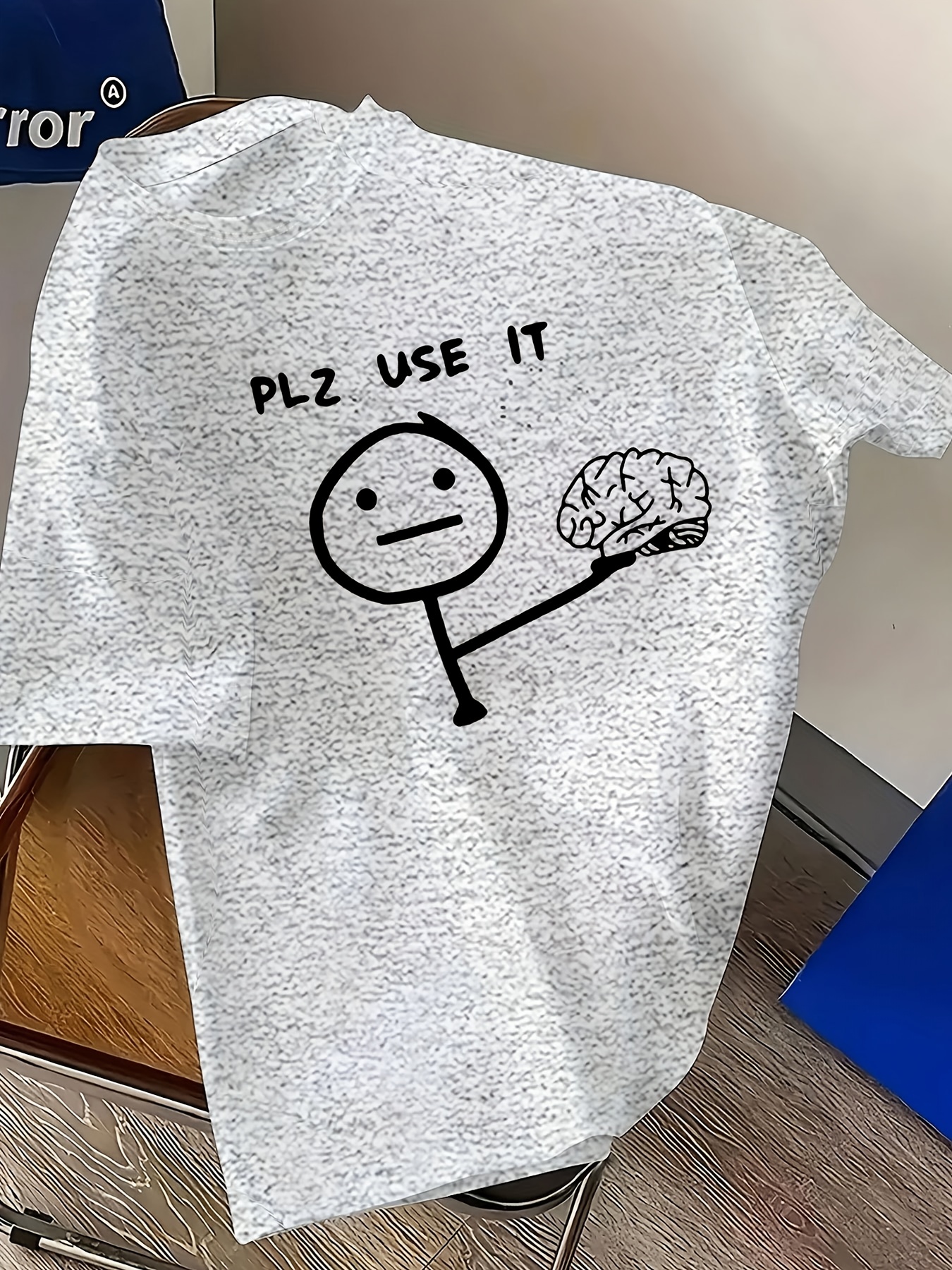 Men'S Funny Graphic T-Shirt - "PLZ USE IT" with Stick Figure & Brain Design - Royal Blue Crew Neck Tee - Lightweight Summer Shirt for Everyday Casual Wear - Funny Conversation Starter Apparel for Men, Humorous Clothing, Playf