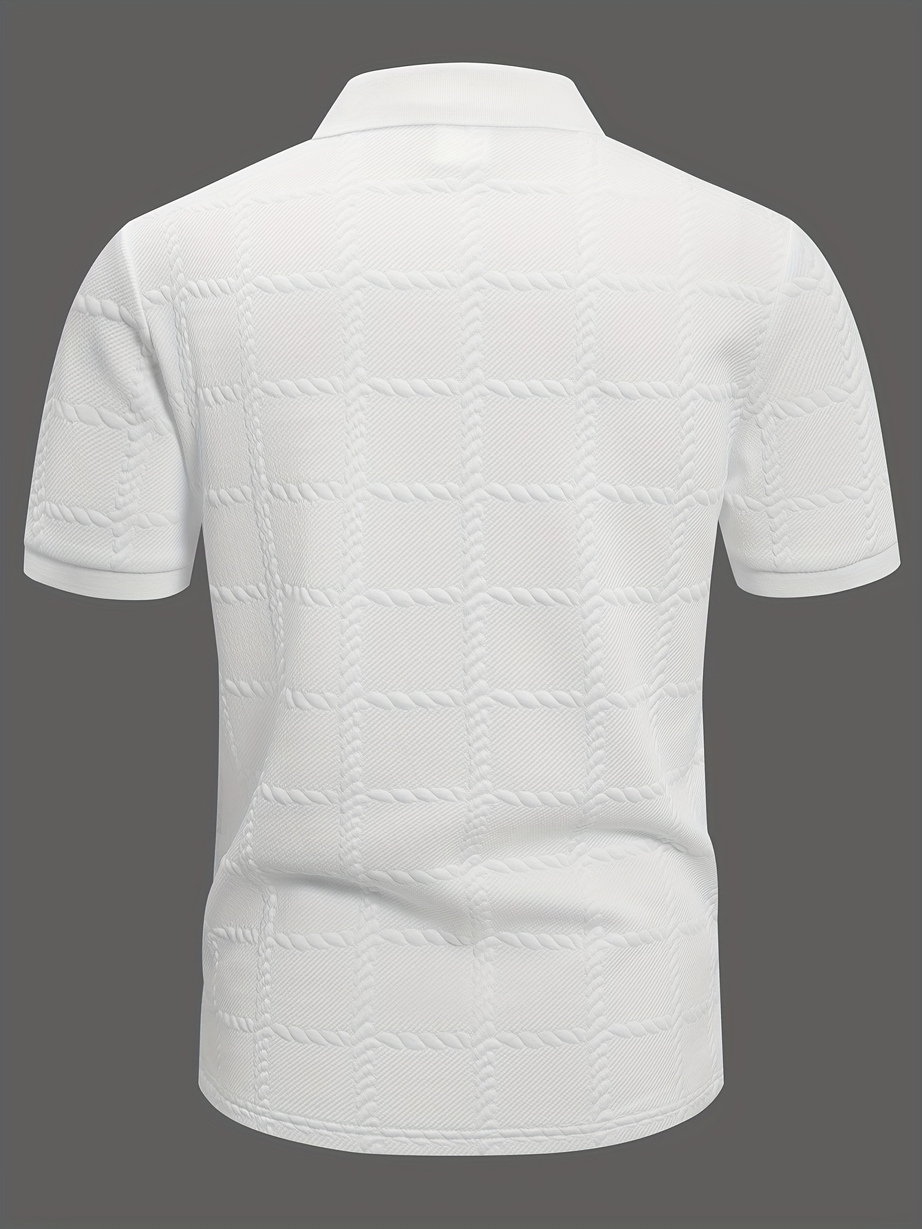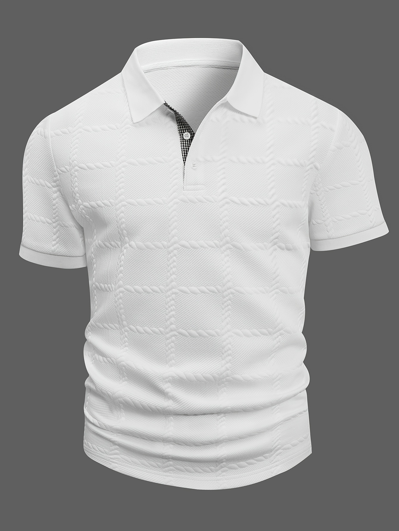 Men's Short Sleeve Shirt with Geometric Jacquard Textured Check Pattern, Classic Solid Color Flat Knit Ribbed Collar and Cuffs, Houndstooth Patch Design on Placket, Golf Casual Wear, Everyday Workwear, Outdoor Casual Clothing