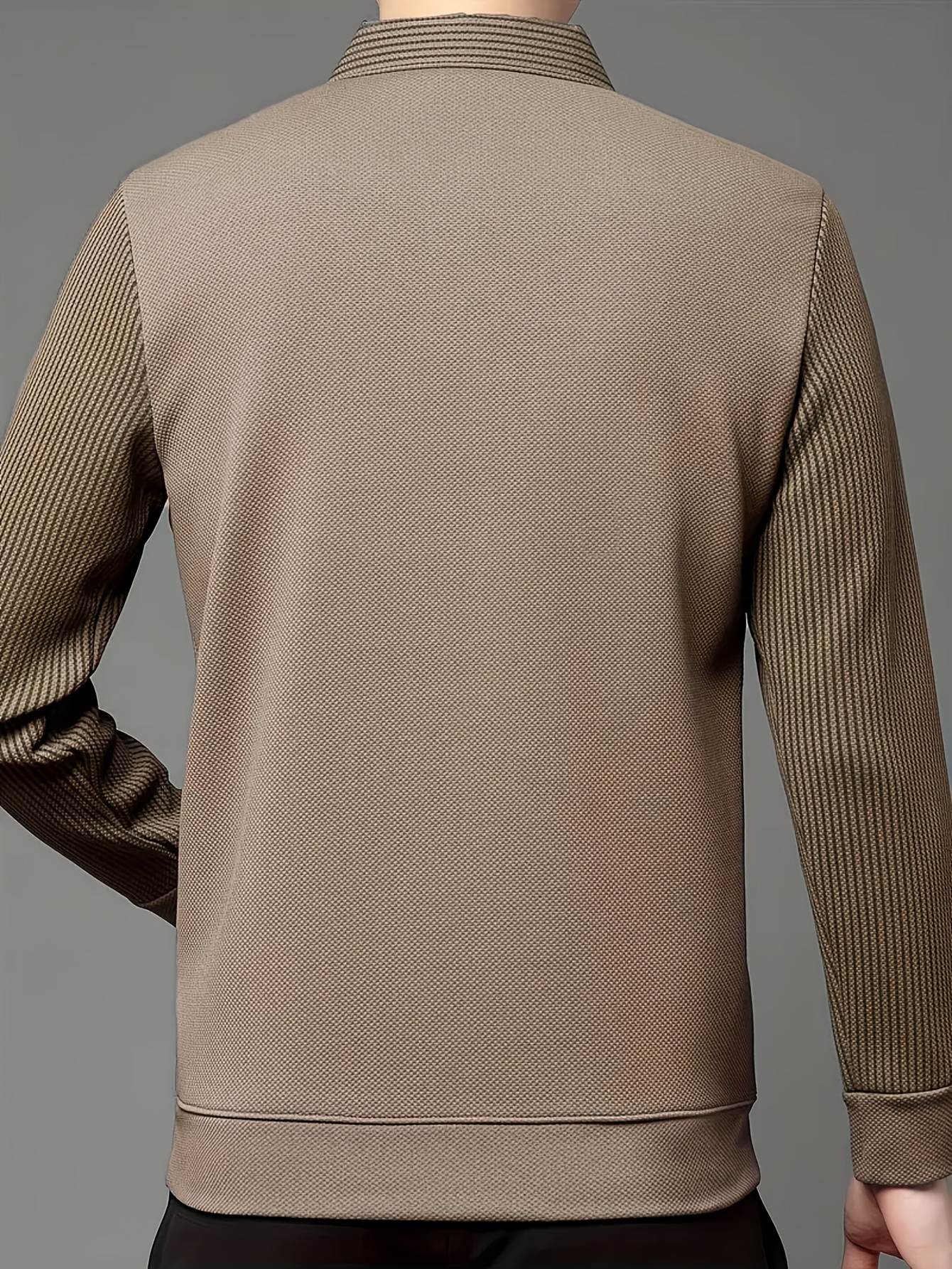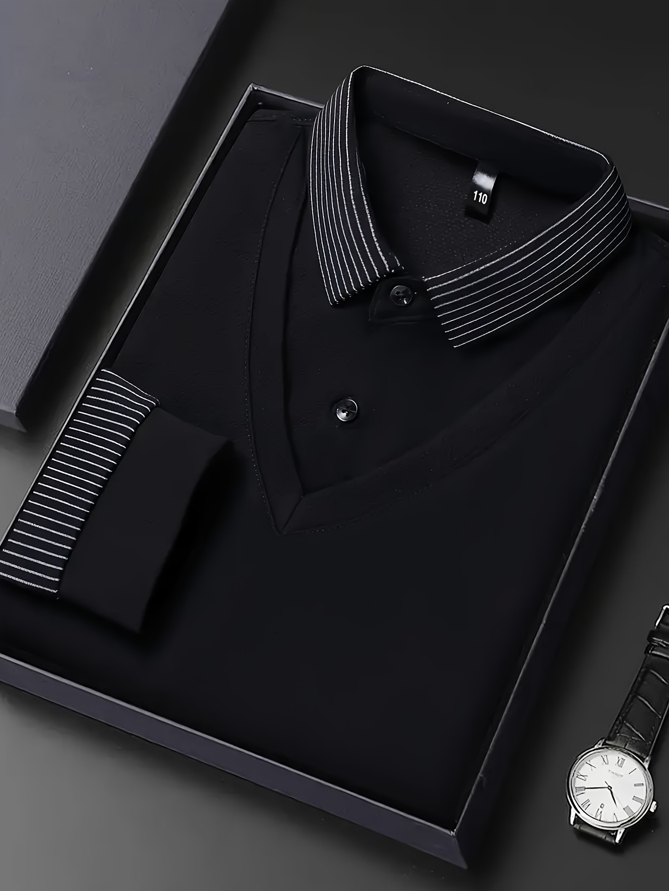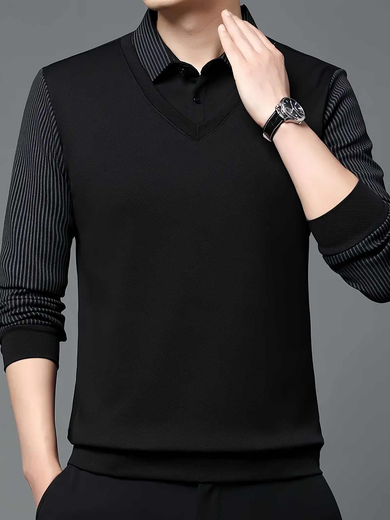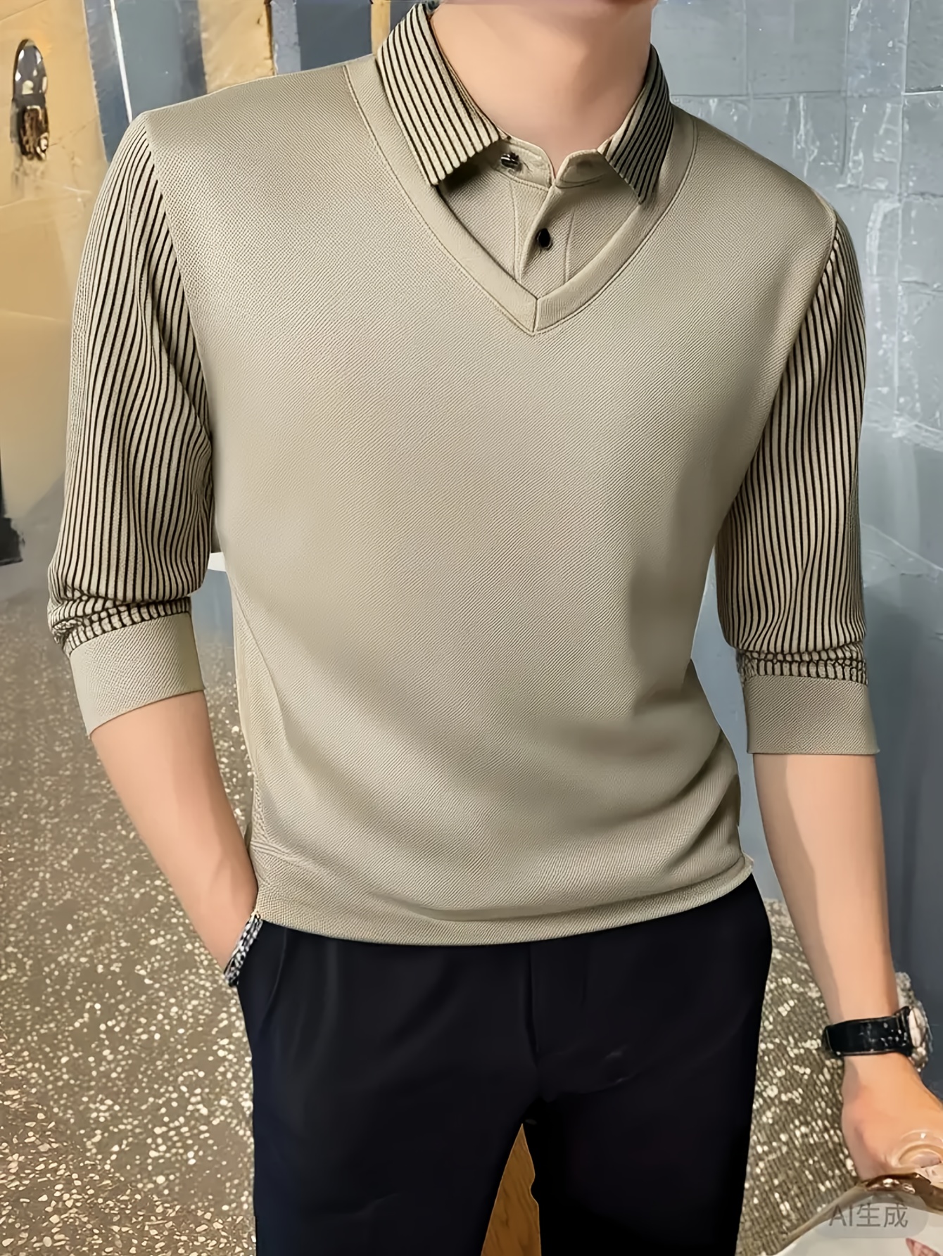 Men'S Two-in-One Long Sleeve T-Shirt - Navy & Striped Patchwork Collar Shirt, Button-Up Front, Breathable Fabric, Regular Fit for Business & Casual Wear, Versatile Clothing | Classic Collar Shirt | Stylish Contrast Design