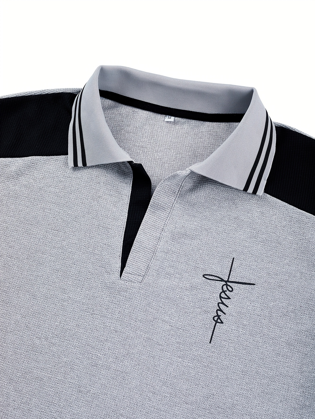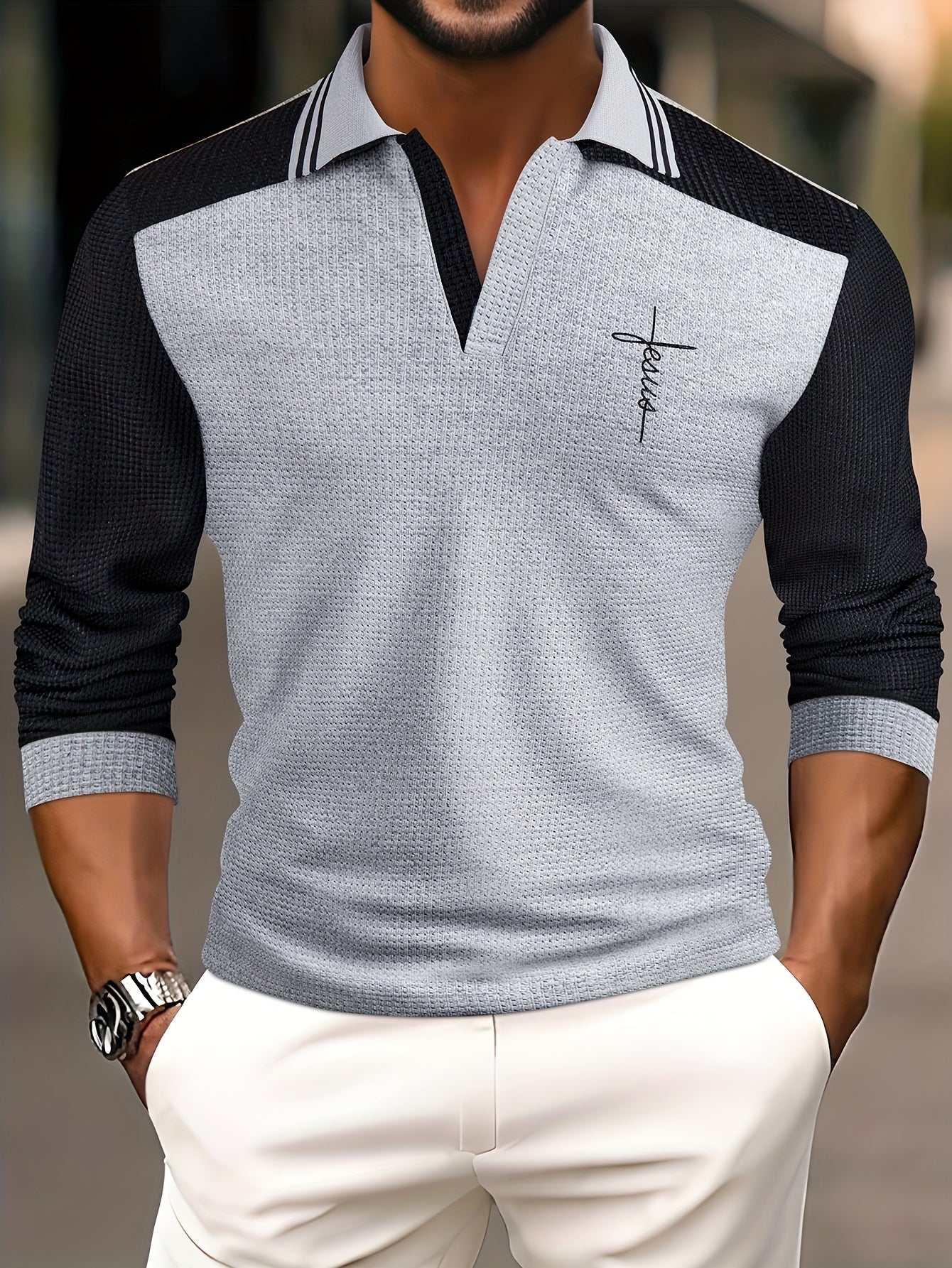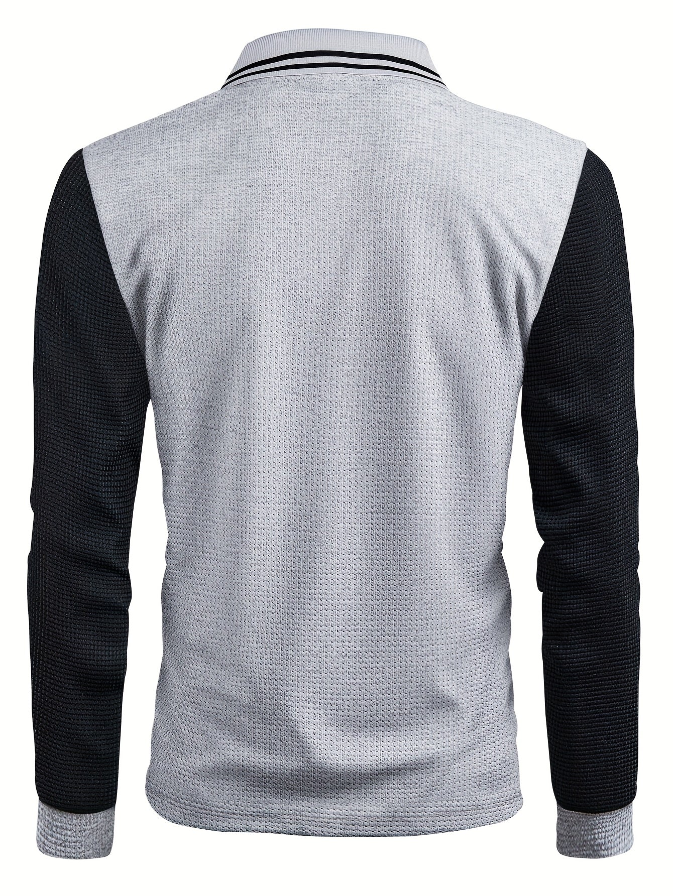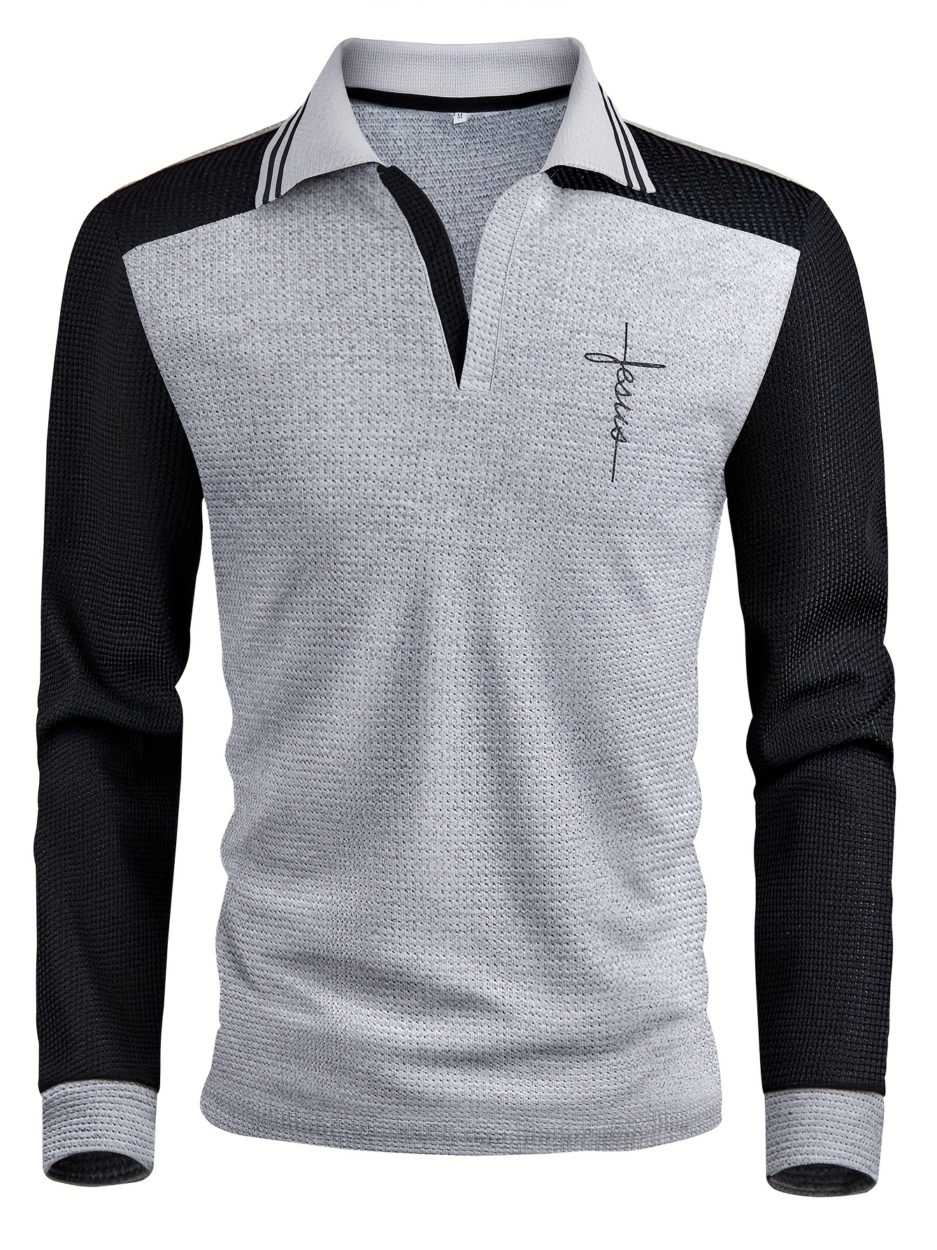 Men'S Waffle Knit V-Neck Long Sleeve Polo Shirt with Contrast Trim, Letter Print, and Chest Emblem - Casual Fall Outdoor Wear, Regular Fit, Pullover Style, Casual Wear|Vneck Shirt|Waffle Knit Texture
